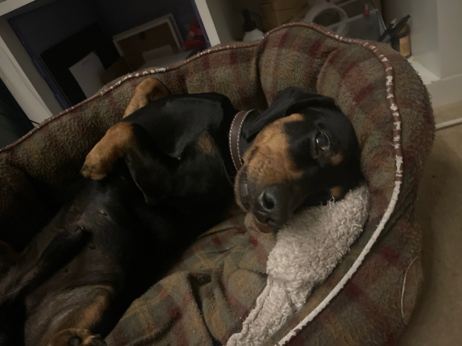 A black and tan dachshund lies on its back in a brown and plaid dog bed with a fluffy white insert. The dog wears a brown collar. The bed sits on the floor next to what appears to be a white cabinet o…read more