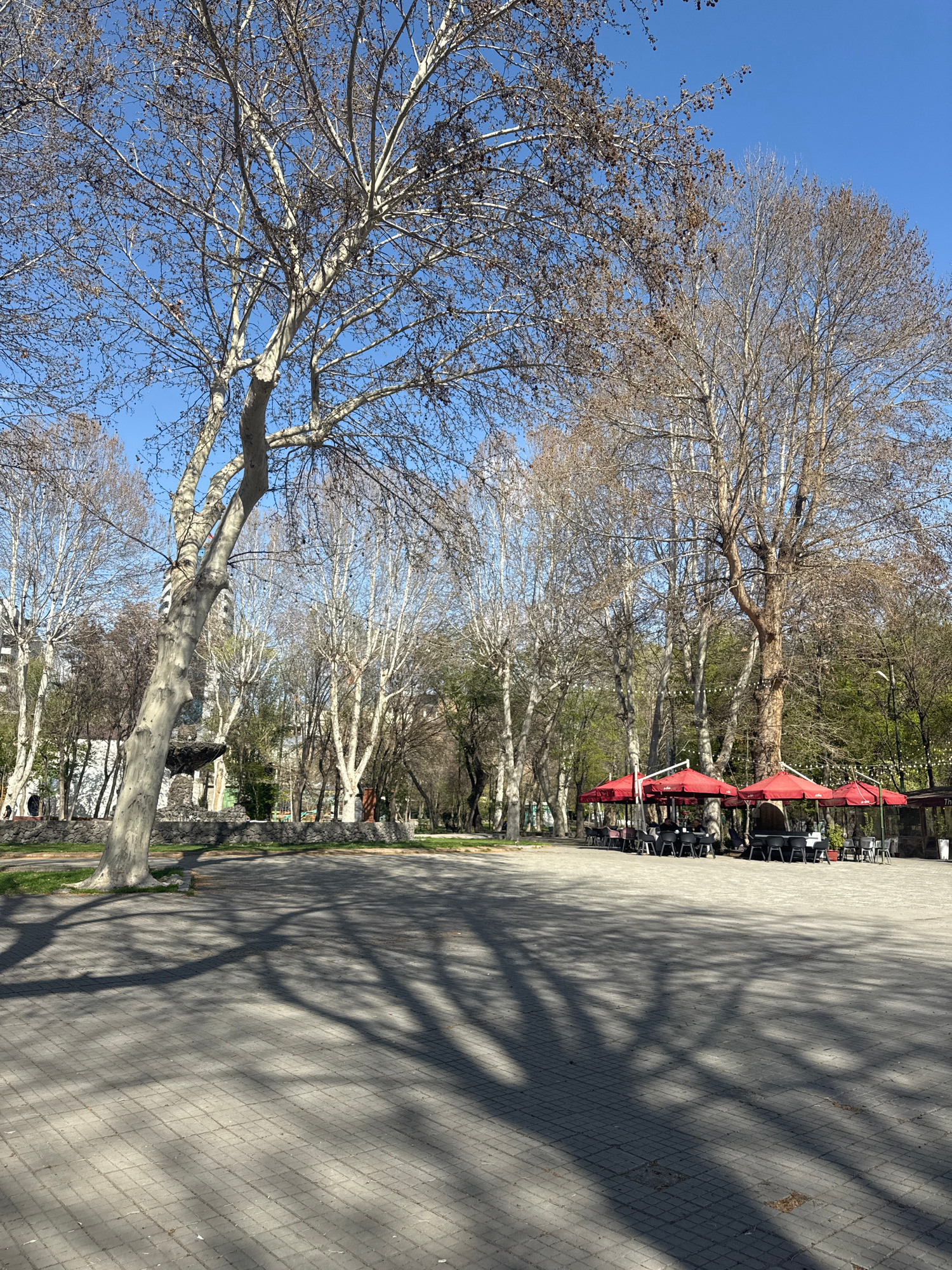 The image shows a street in Yerevan, Armenia lined with bare trees. The trees cast long shadows on the paved walkway. Red umbrellas and tables suggest a cafe or outdoor seating area along the street.…read more