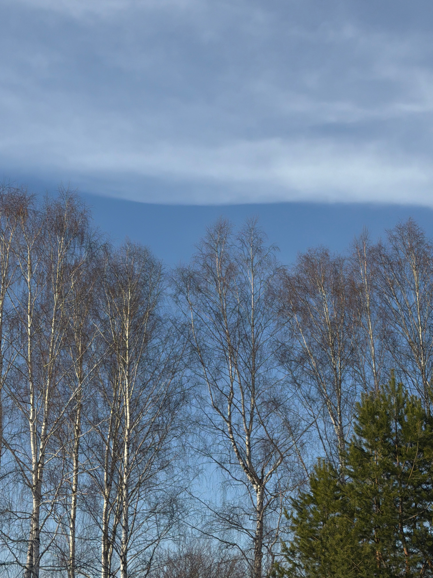 The image shows a view looking up into the sky with trees in the foreground. The sky is a pale blue with a wispy white cloud formation on the left side. On the right, there are several bare-branched trees with white trunks. Towards the top right, there is a dense patch of green foliage, suggesting a coniferous tree. The image seems to have been taken in a forest, where Dubovaya is located in Russia. The scene is peaceful and focuses on the natural elements of the sky and trees. | Open Wire
