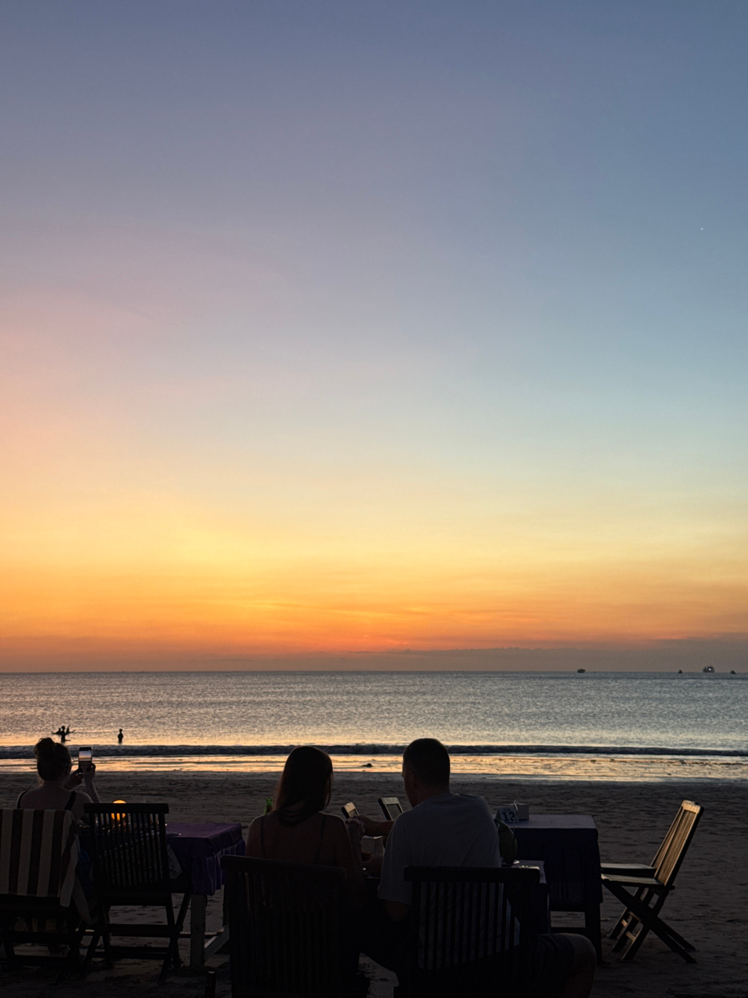 The image depicts a beach scene in Kuta Selatan, Indonesia, at dusk or dawn. The sky transitions from a light blue to orange near the horizon, above a grey ocean. On the right side of the image, peopl…read more