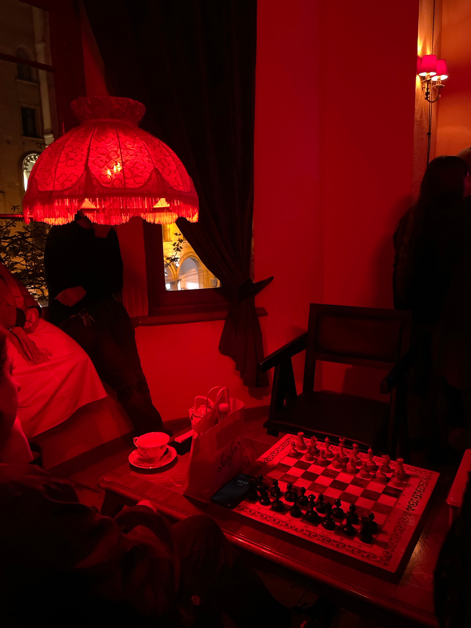 The scene is illuminated by a red light, likely from the tasseled lamp on the left, which casts the room in a reddish hue. An unidentifiable person is reclining or sitting in the lower portion of the…read more