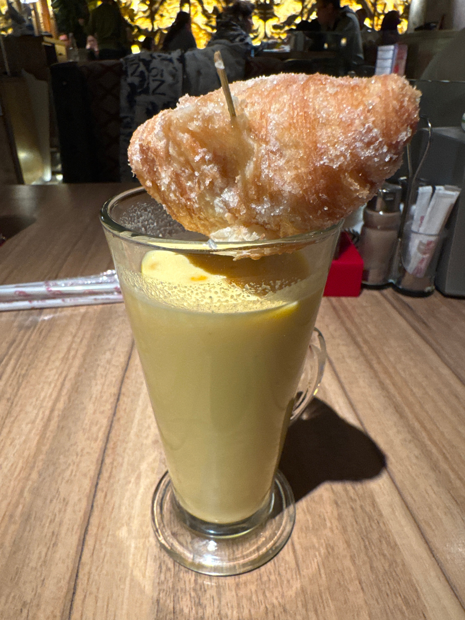 The image shows a tall glass of milky yellow drink, possibly horchata, topped with a pastry skewered with a stick. The pastry appears to be a croissant or similar, coated with granulated sugar. The gl…read more