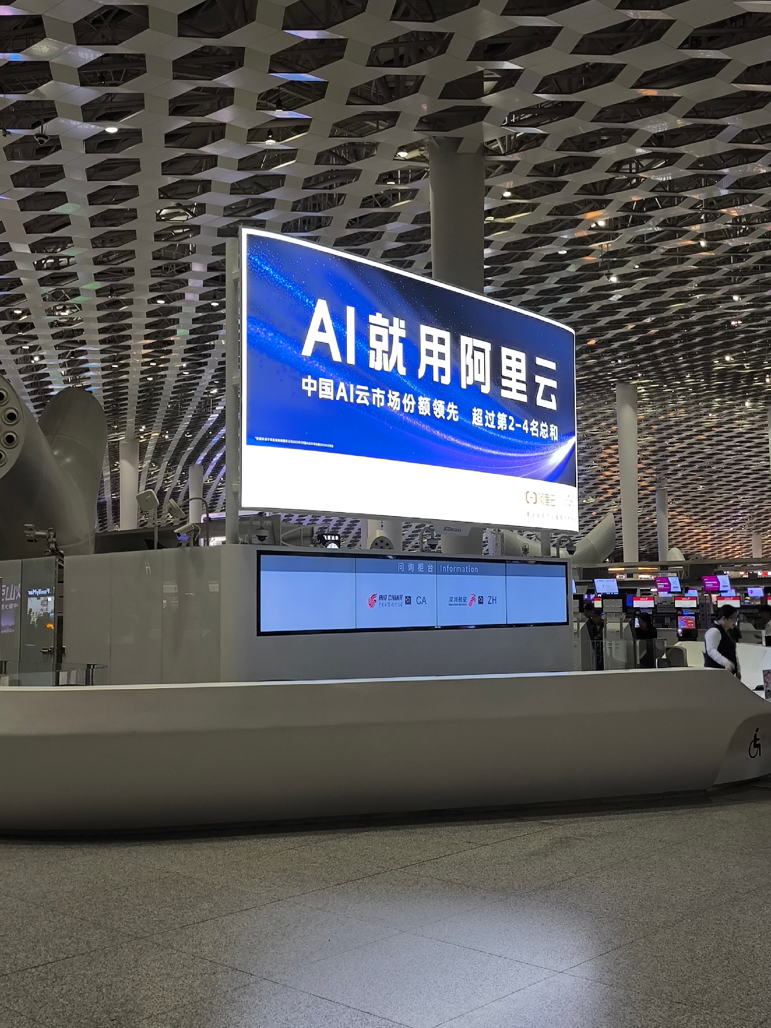 The image captures a scene at Shenzhen Bao'an International Airport in Bao'an District, Shenzhen, China. A prominent illuminated sign displays an advertisement for Alibaba Cloud's AI services, featuri…read more