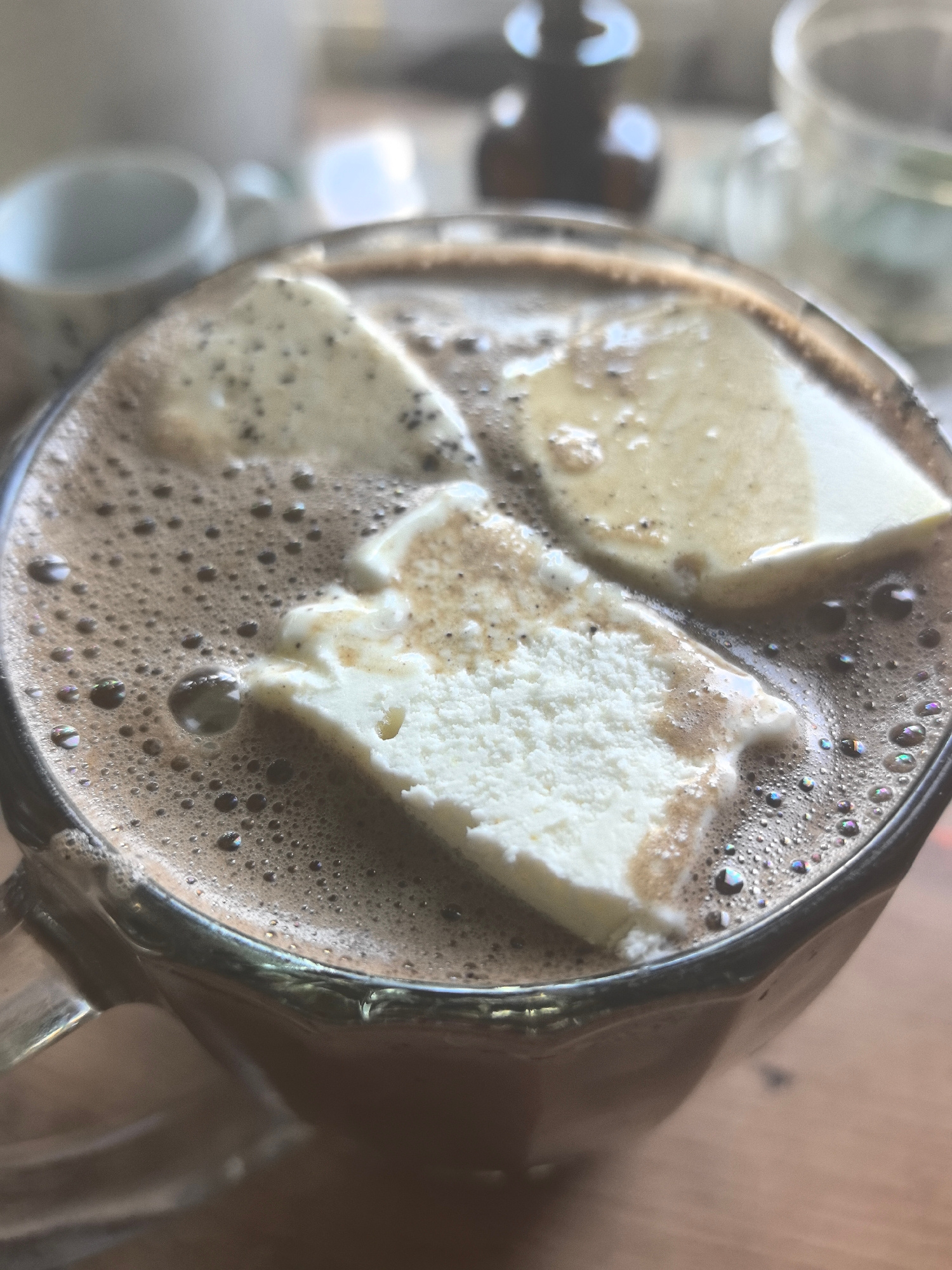 A close-up, high-angle shot focuses on a clear glass mug filled with rich, dark hot chocolate, topped with three substantial pieces of white, possibly homemade, marshmallows or whipped cream. The hot…read more