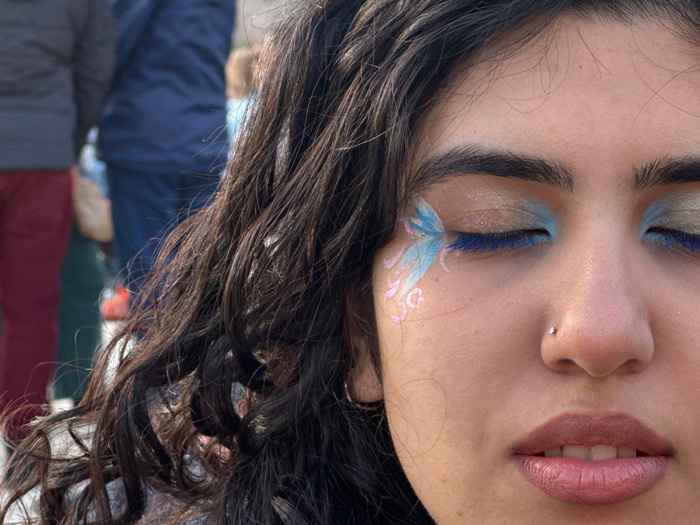 The image provides a close-up view of the right side of a young adult female's face (viewer's left side obscured by hair), with her eyes closed. Her dark, wavy hair frames her face. Her eyelids are ad…read more