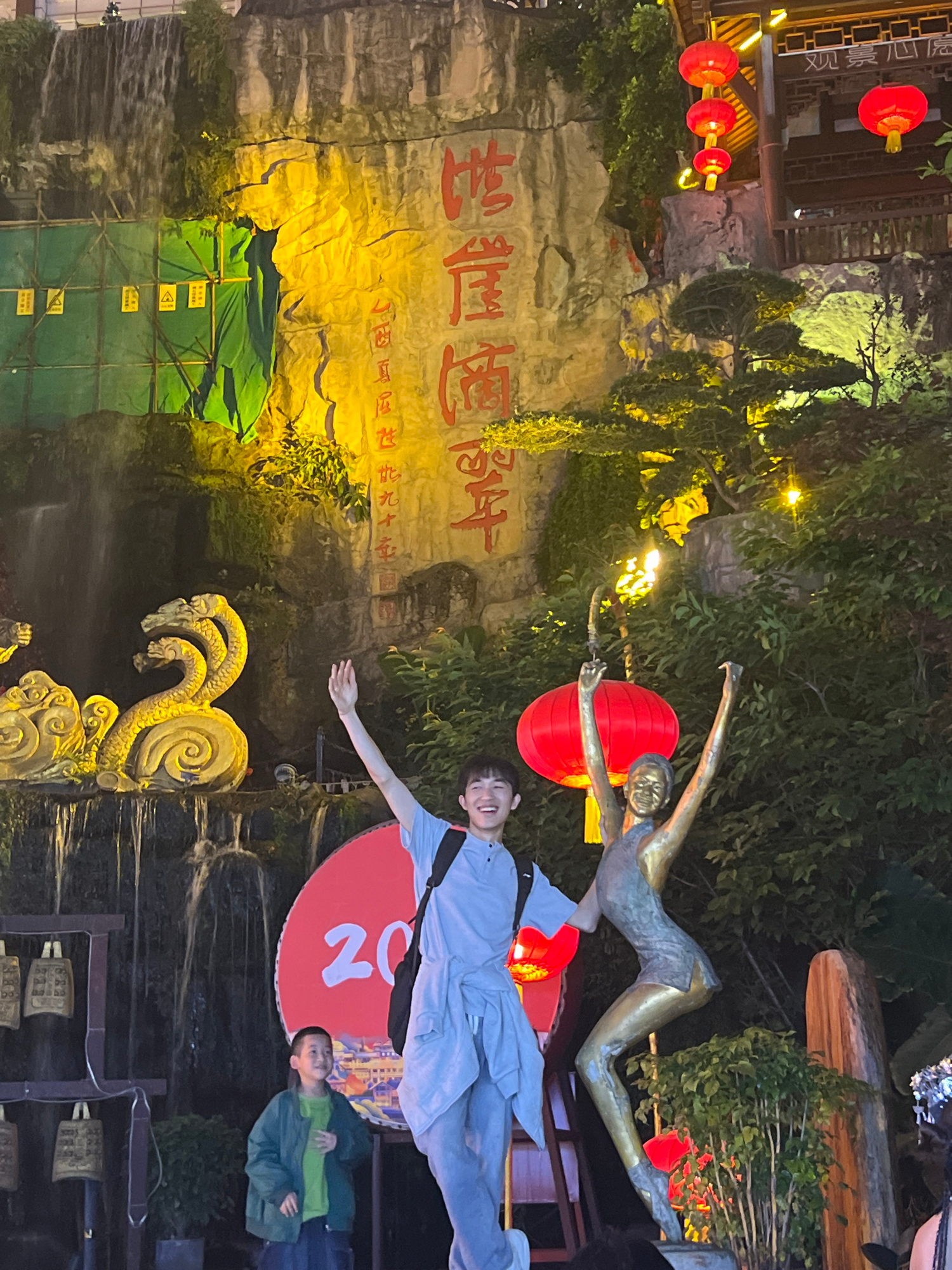A nighttime outdoor scene shows a man standing with arms outstretched in front of a display in Yuzhong District, China. To his upper right is a bronze-colored statue of a figure seemingly in mid-fligh…read more