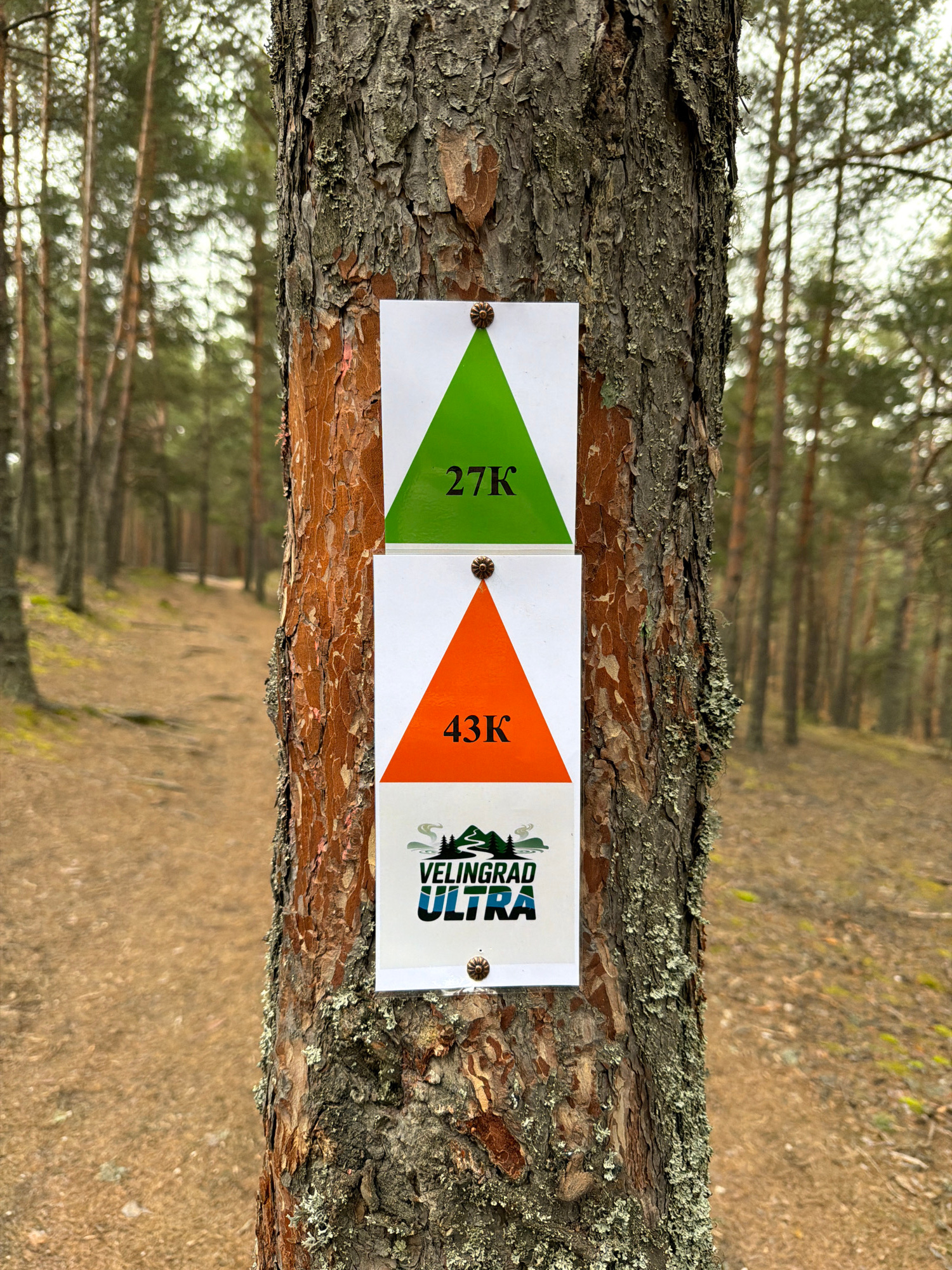 Three signs are affixed to a tree trunk, likely along a trail. The first sign, on the left, is white with a green triangle pointing left and the text "27K". The second sign is white with an orange tri…read more