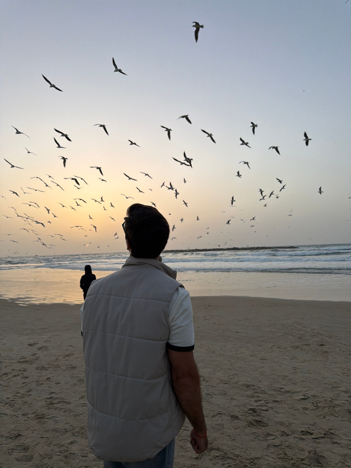 A man stands on a beach with his back to the viewer, gazing towards the ocean. A large flock of birds fills the sky, silhouetted against the setting sun. He is wearing a light-colored puffer vest, a w…read more