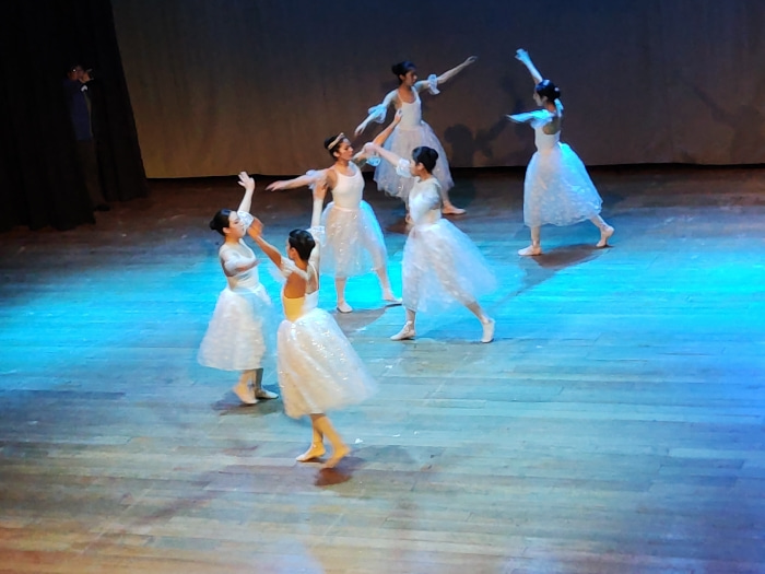 A group of six ballerinas in white tutus perform on a wooden stage, illuminated with blue lighting. Each ballerina has her hair neatly styled. One ballerina wears a yellow back leotard. Off to the sid…read more