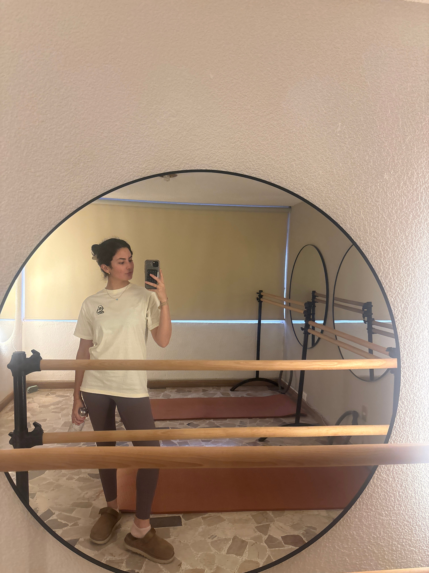 A person stands in front of a round mirror in what appears to be an interior space. The person is holding a smartphone, presumably taking a selfie, and their image is reflected in the mirror. The pers…read more