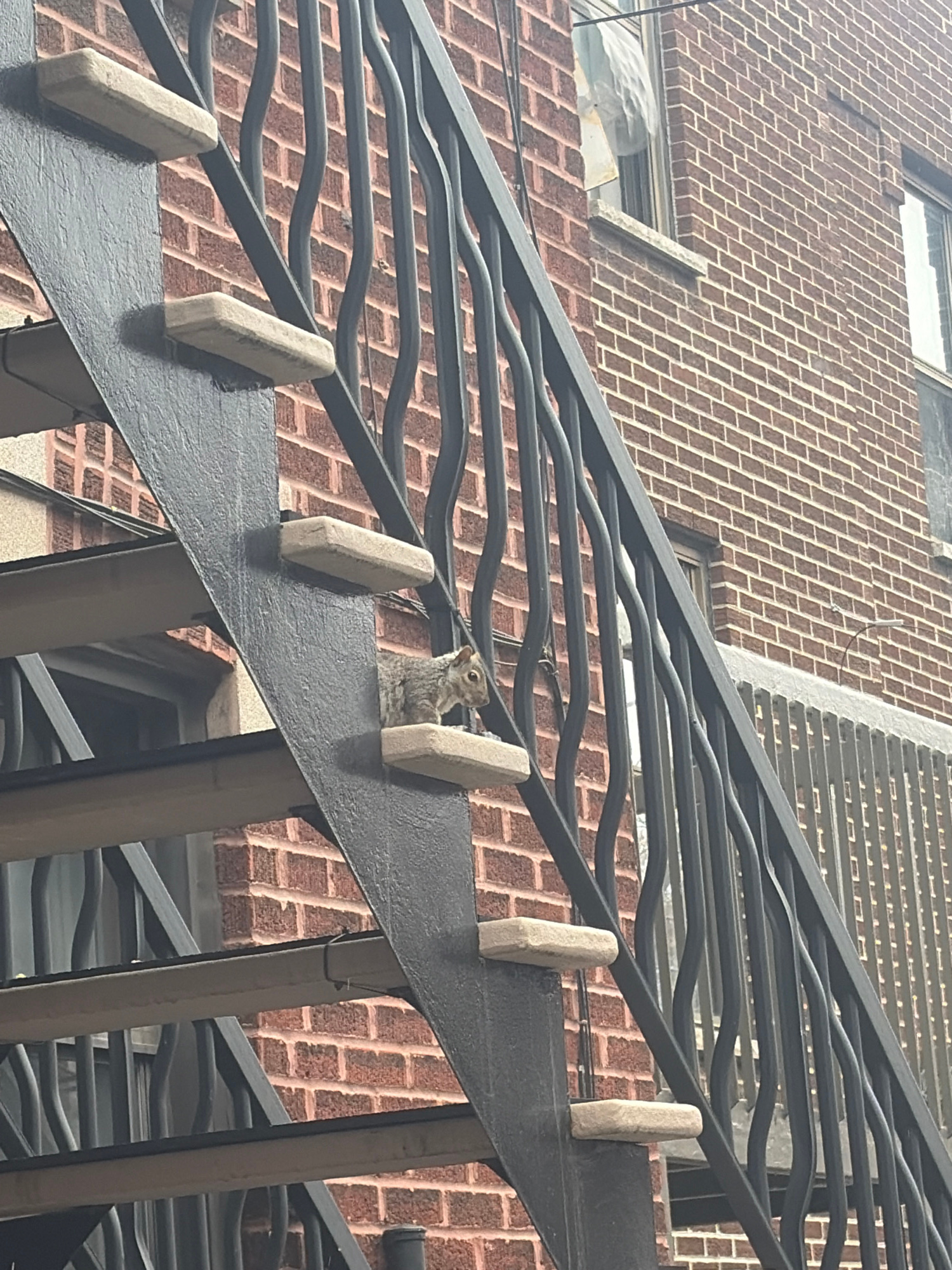 An eastern grey squirrel is prominently featured in the mid-ground, perched on a black metal fire escape attached to a brick building. The squirrel, with grey-brown fur and a lighter belly, is lookingβ¦read more