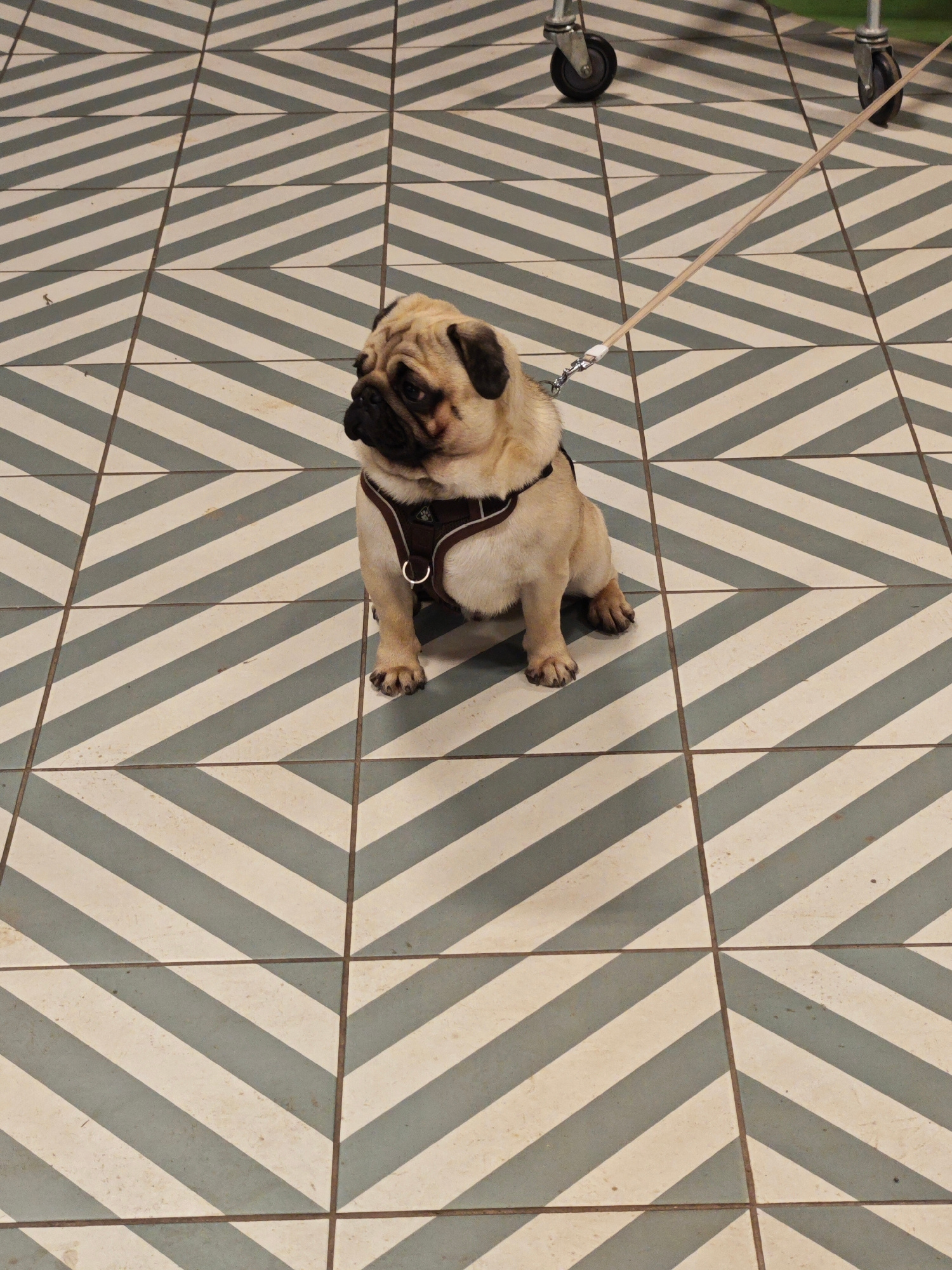 A fawn-colored pug wearing a brown harness and attached to a beige leash is sitting on a tiled floor. The tiles are arranged in a chevron pattern with alternating grey and off-white stripes. The wheel…read more