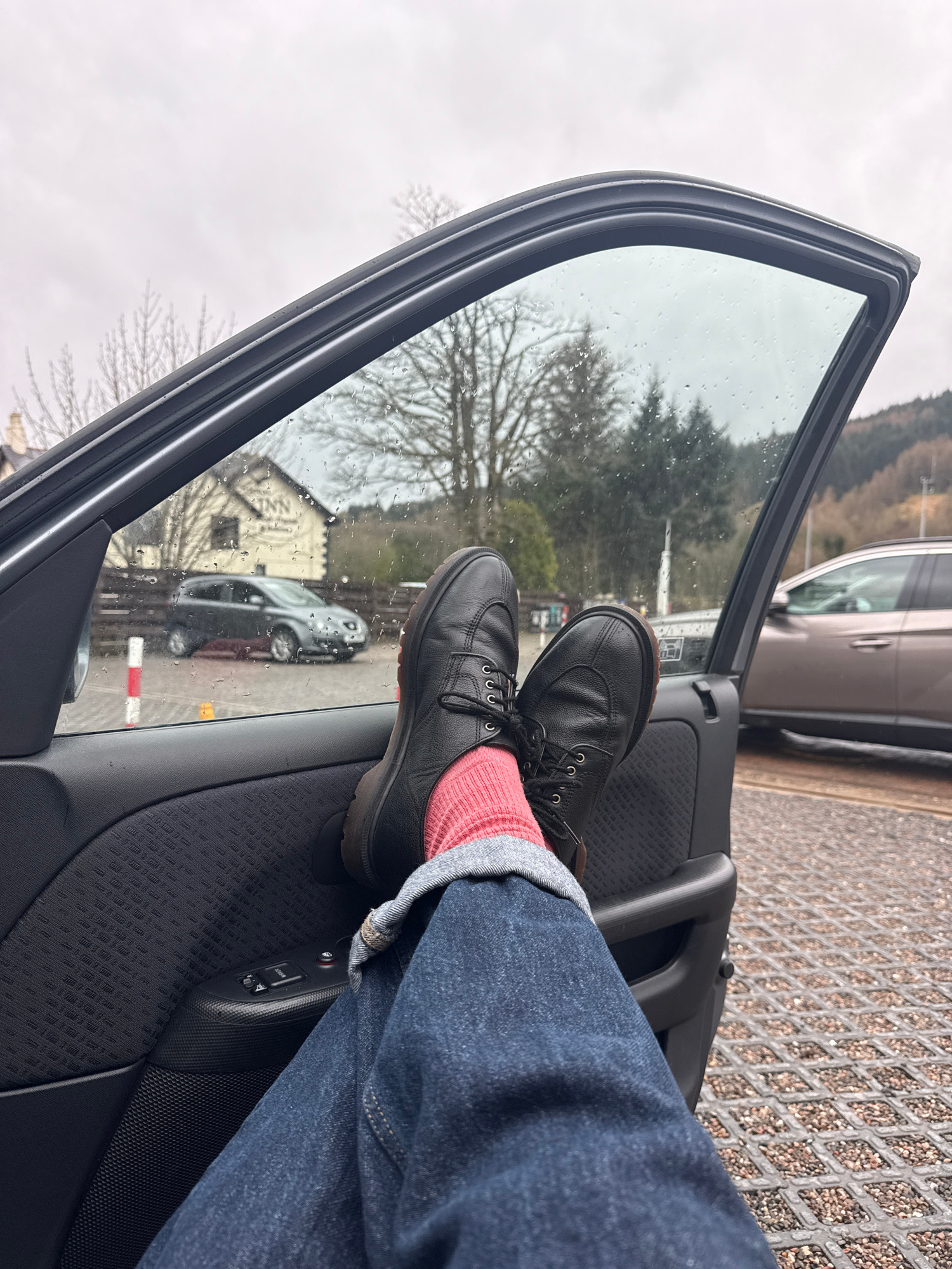 The image shows an interior view through the open door of a car, focused on a person's legs and feet resting on the door panel. The individual is wearing blue jeans cuffed at the ankle and pink socks…read more