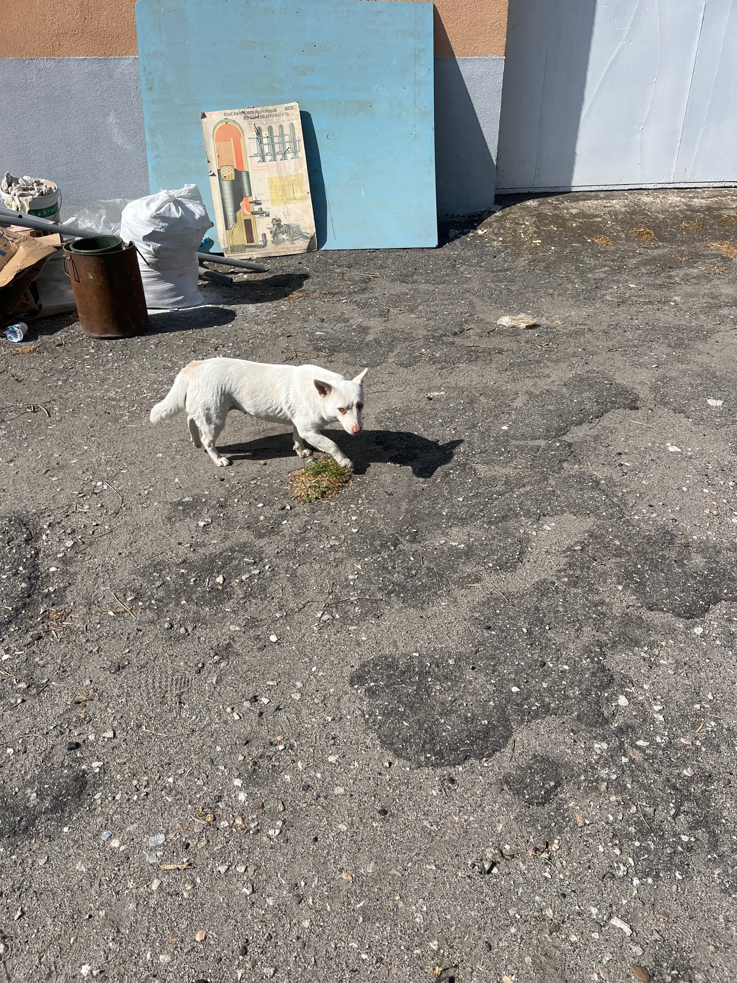 The photograph appears to be taken in an outdoor, urban environment, possibly an alleyway in Asenovgrad, Bulgaria. The ground is paved with asphalt. A white dog is lying on the ground. Next to it, the…read more