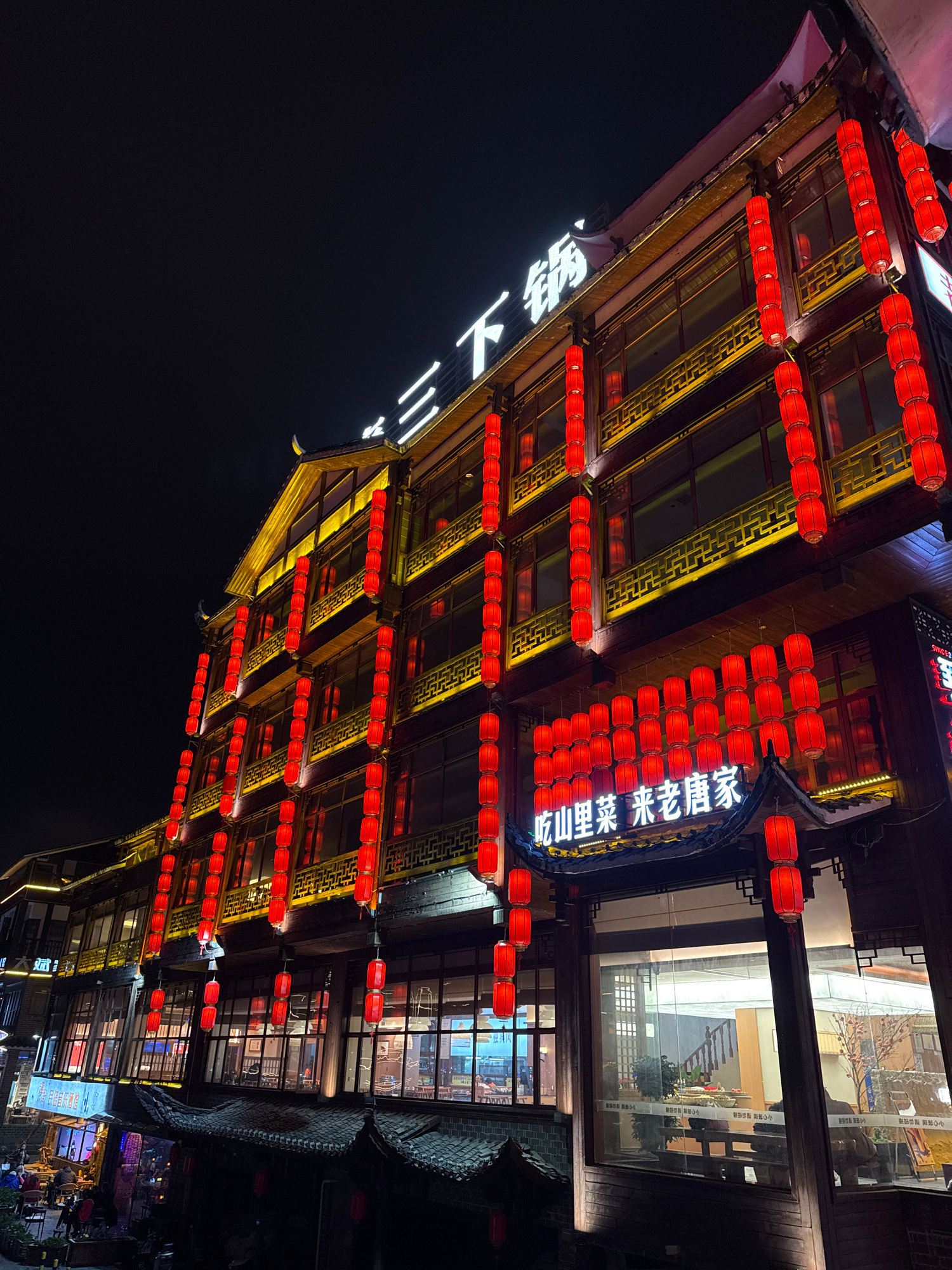 The image shows a building at night in Wulingyuan, China, adorned with rows of traditional red lanterns. The building's architecture features ornate, yellow latticework. A sign in Chinese characters h…read more
