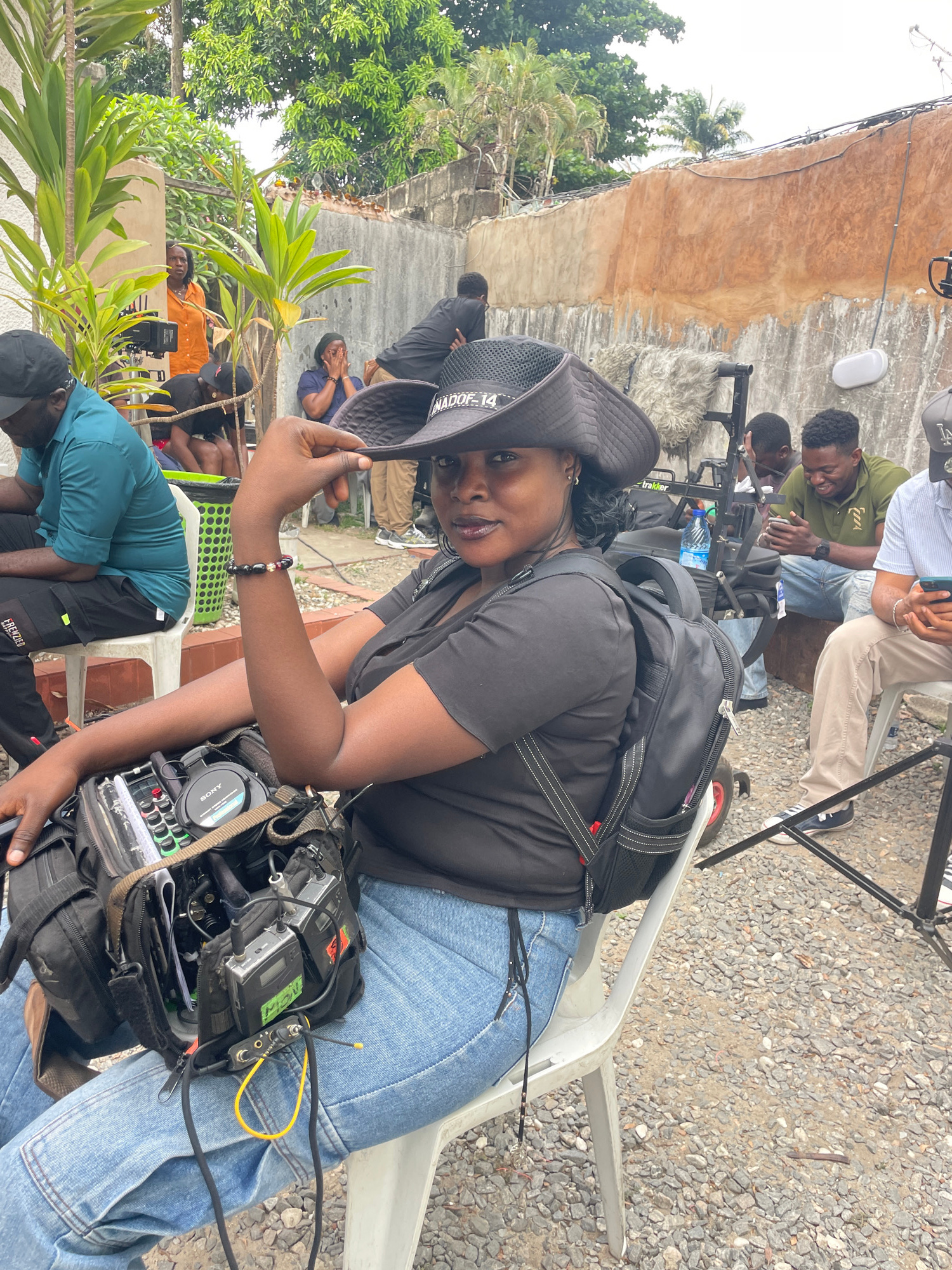 The image captures a film set in Lagos, Nigeria. A woman wearing a black t-shirt, blue jeans, and a black cap is seated on a white plastic chair, holding her cap. She has a backpack and a sound record…read more