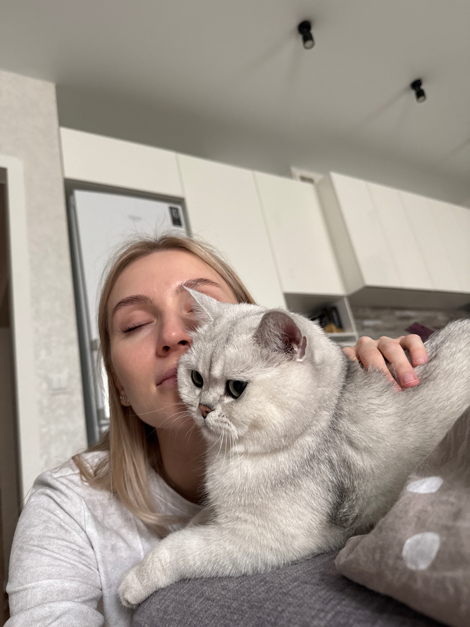 A pale-skinned woman with blonde hair is holding a silver British Shorthair cat. The woman's eyes are closed and her head is tilted slightly. The cat is looking down. The background includes a white w…read more