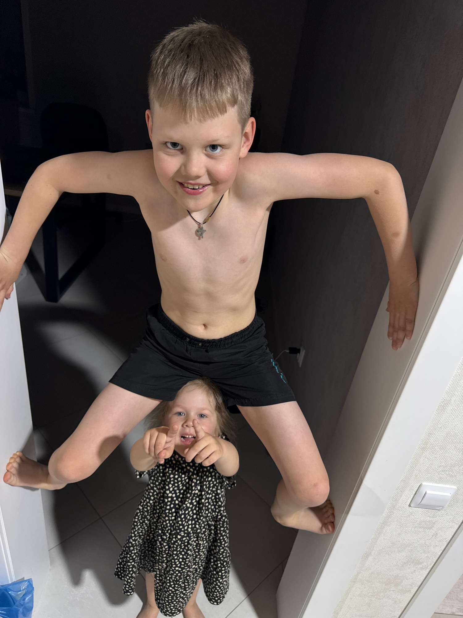 Two children are posing for a photo. A shirtless boy with blond hair is holding onto the ceiling, with a younger girl, wearing a black dress with white polka dots, standing under his legs. The backgro…read more