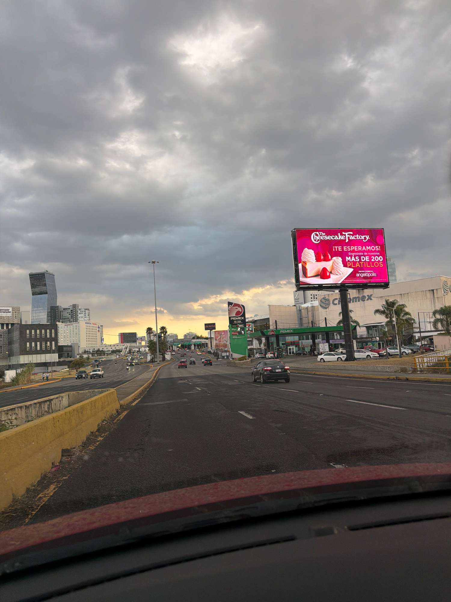 The image shows a street scene in Puebla, Mexico, with a focus on a large billboard for The Cheesecake Factory. The billboard advertises over 200 menu items and refers to "angelópolis," which is a wel…read more