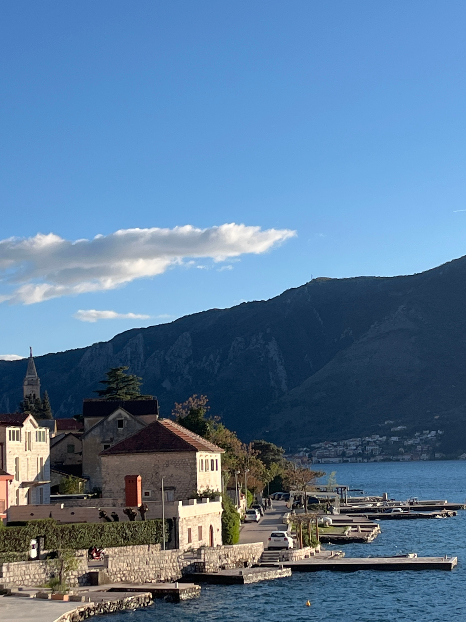 The image shows a section of Dobrota, Montenegro. A tall, dark mountain dominates the background, meeting the edge of the blue sea. Adjacent to the coastline is a stone wall with a road running alongs…read more