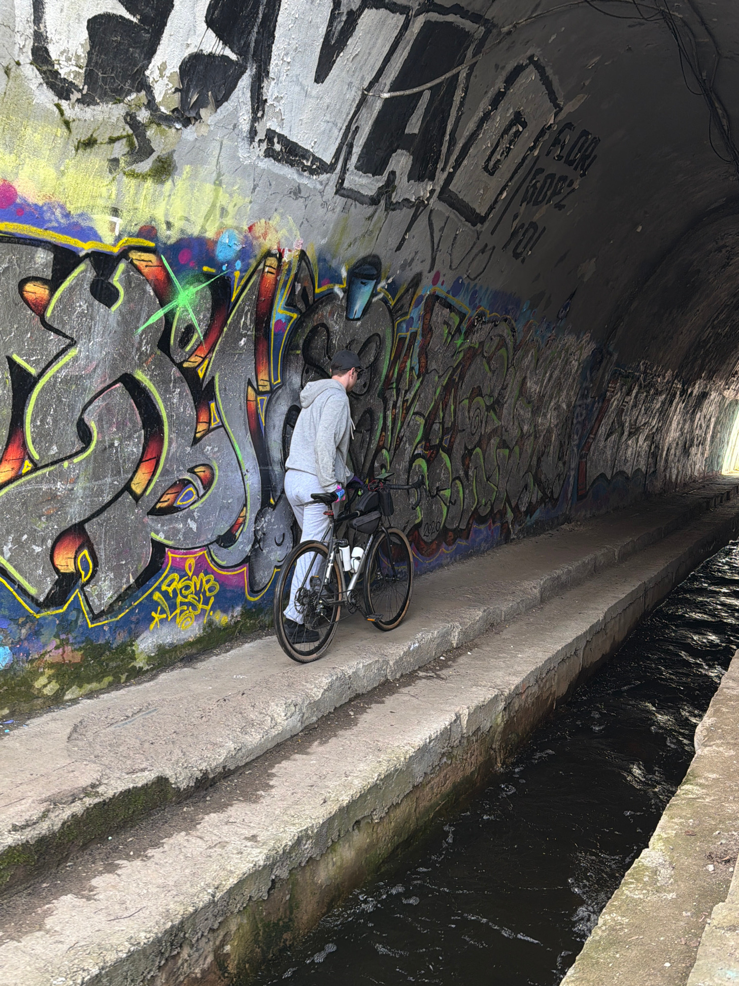 A cyclist wearing light grey clothing lies on a graffiti-covered floor next to their bicycle in a concrete culvert. A narrow stream runs along the right side of the culvert. The culvert appears to be…read more