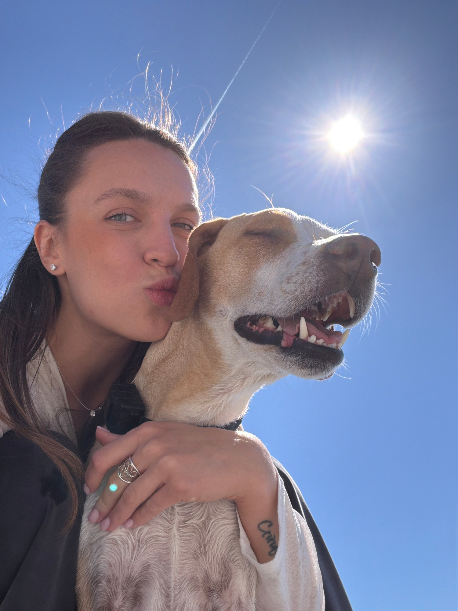 A young woman with long, dark hair and light eyes is holding a light-colored dog in her arms. She is making a kissing face, while the dog has its mouth open, seemingly smiling or yawning. The woman is…read more