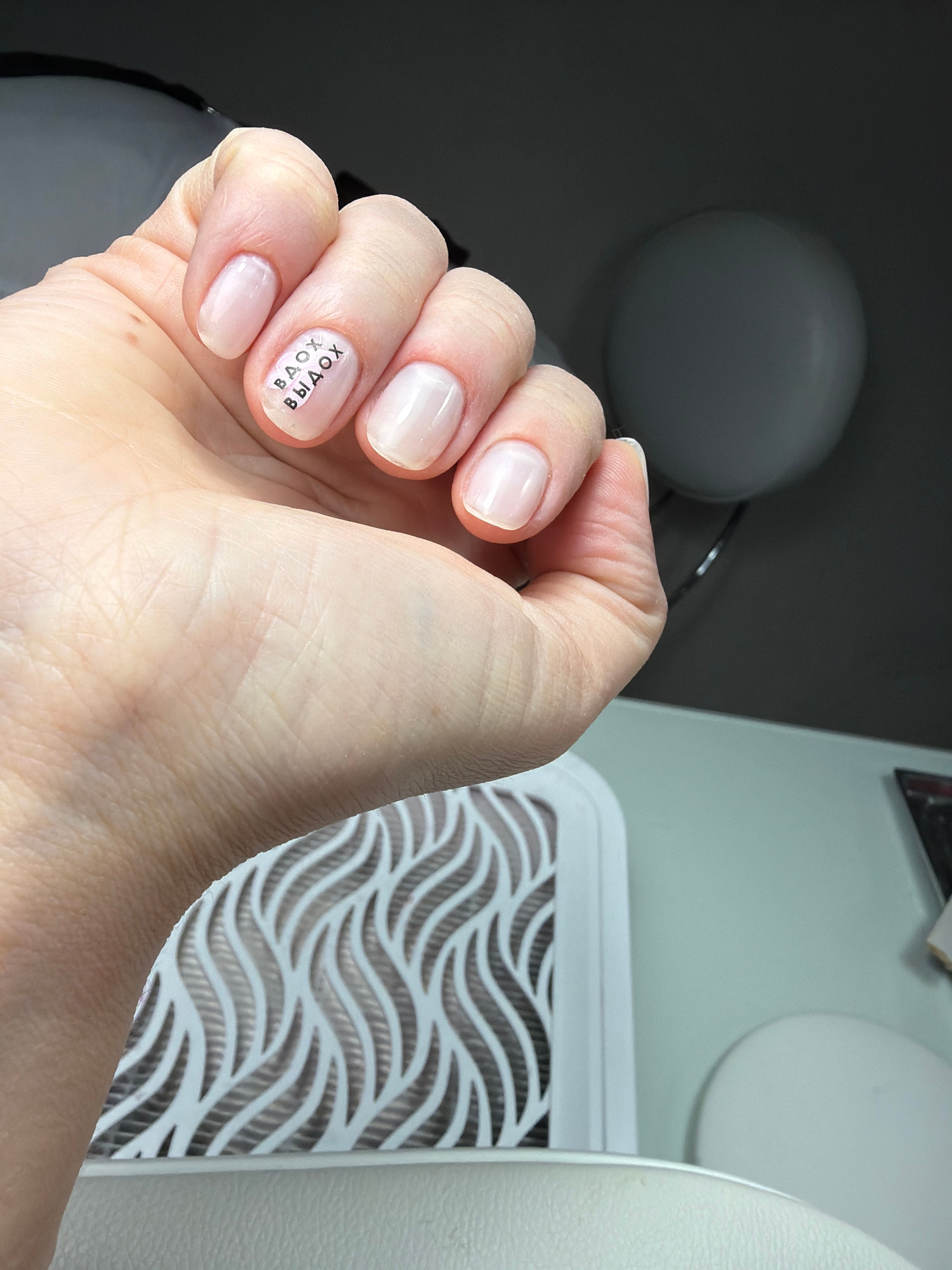 A close-up shot depicts a Caucasian woman's hand, positioned with fingers slightly curled, revealing neatly manicured fingernails painted with a light pink polish. Black lettering "BAOX" is mirrored a…read more