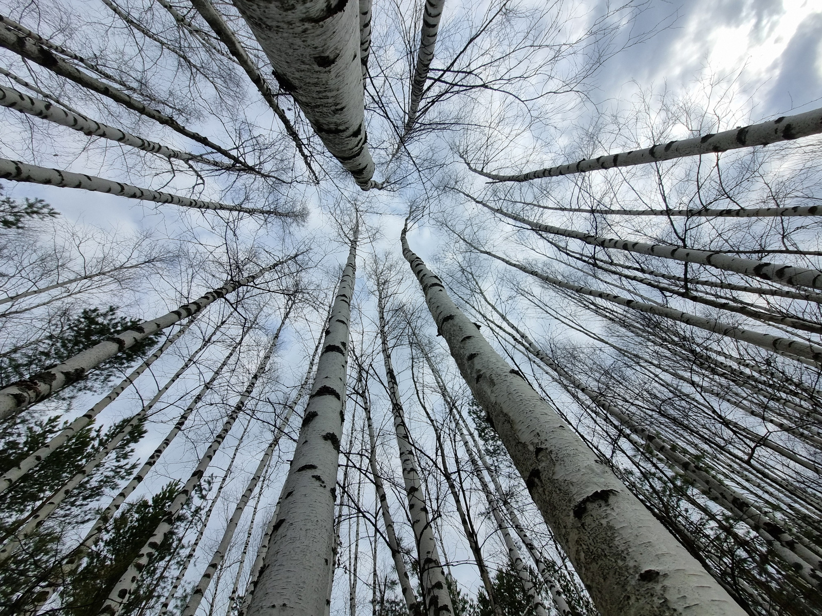 The image shows a low-angle view looking upwards through a dense birch forest in Kemul, Russia. The birch trees are characterized by their white bark with black markings, typical of the species. Mostβ¦read more