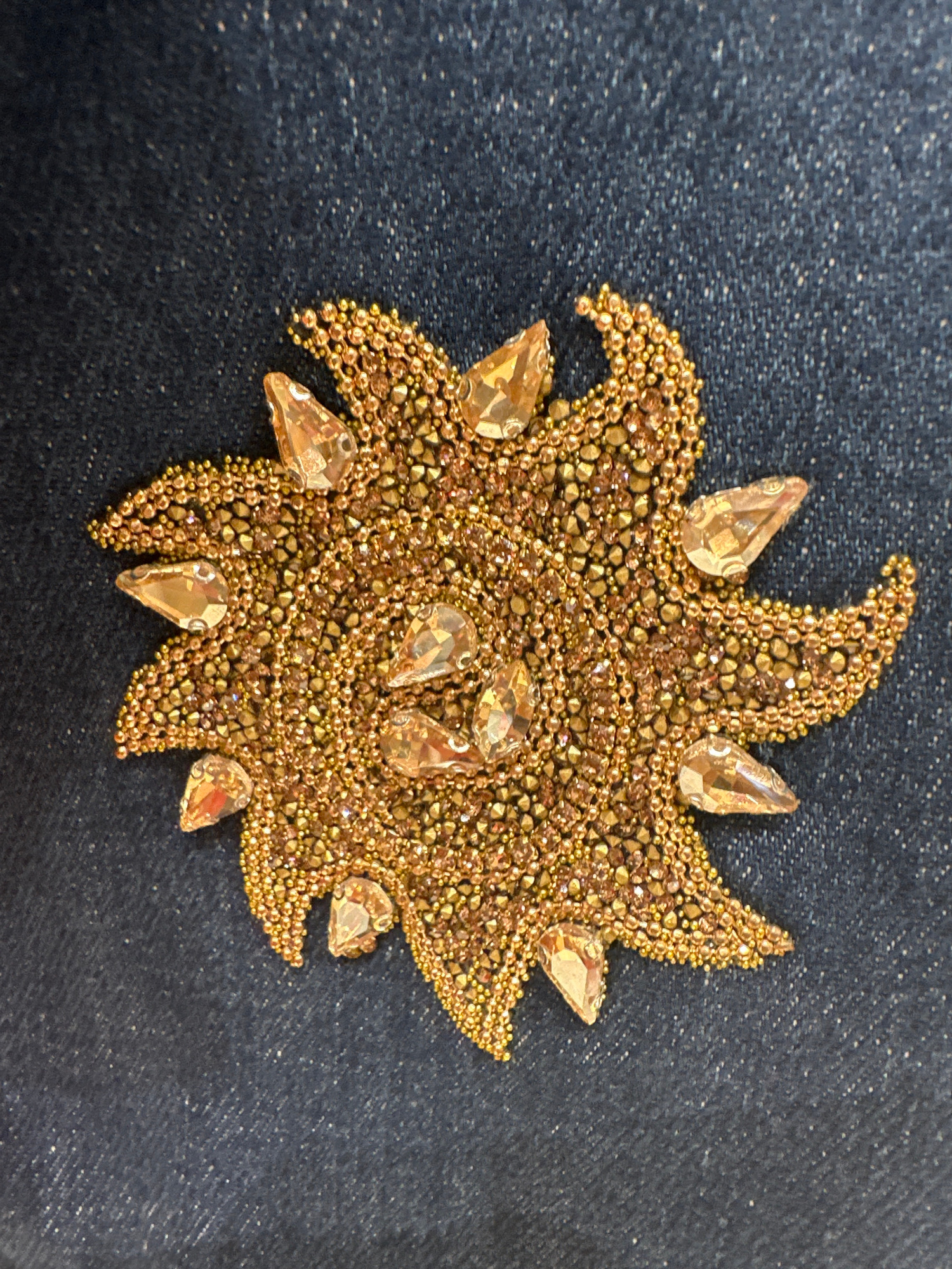 A gold-colored embellishment, resembling a stylized sun or flower, is sewn onto a blue denim fabric. The embellishment is constructed from small, round gold beads and larger, teardrop-shaped rhinestonโฆread more