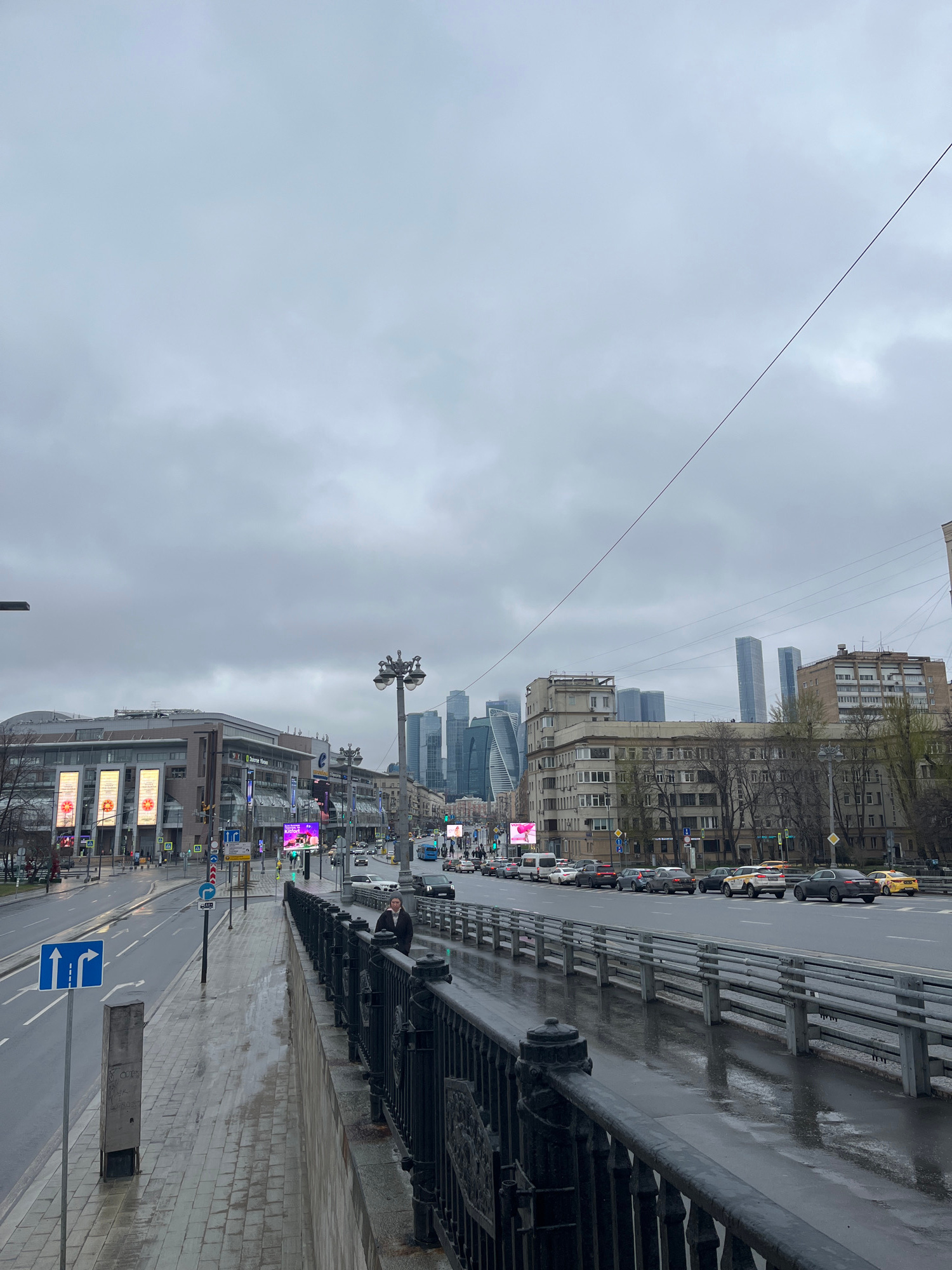 The image depicts a street scene in Moscow, Russia, likely taken on a rainy day. The sky is overcast, and the ground is wet. The view is from a bridge or elevated structure, looking towards a street l…read more