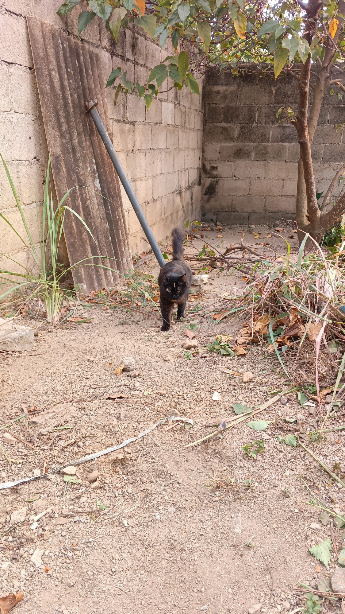 The scene depicts a dirt yard in San Felipe, Venezuela. A cinder block wall forms two sides of the space. Leaning against the left wall is a corrugated sheet and a gray metal pipe. To the right of the…read more