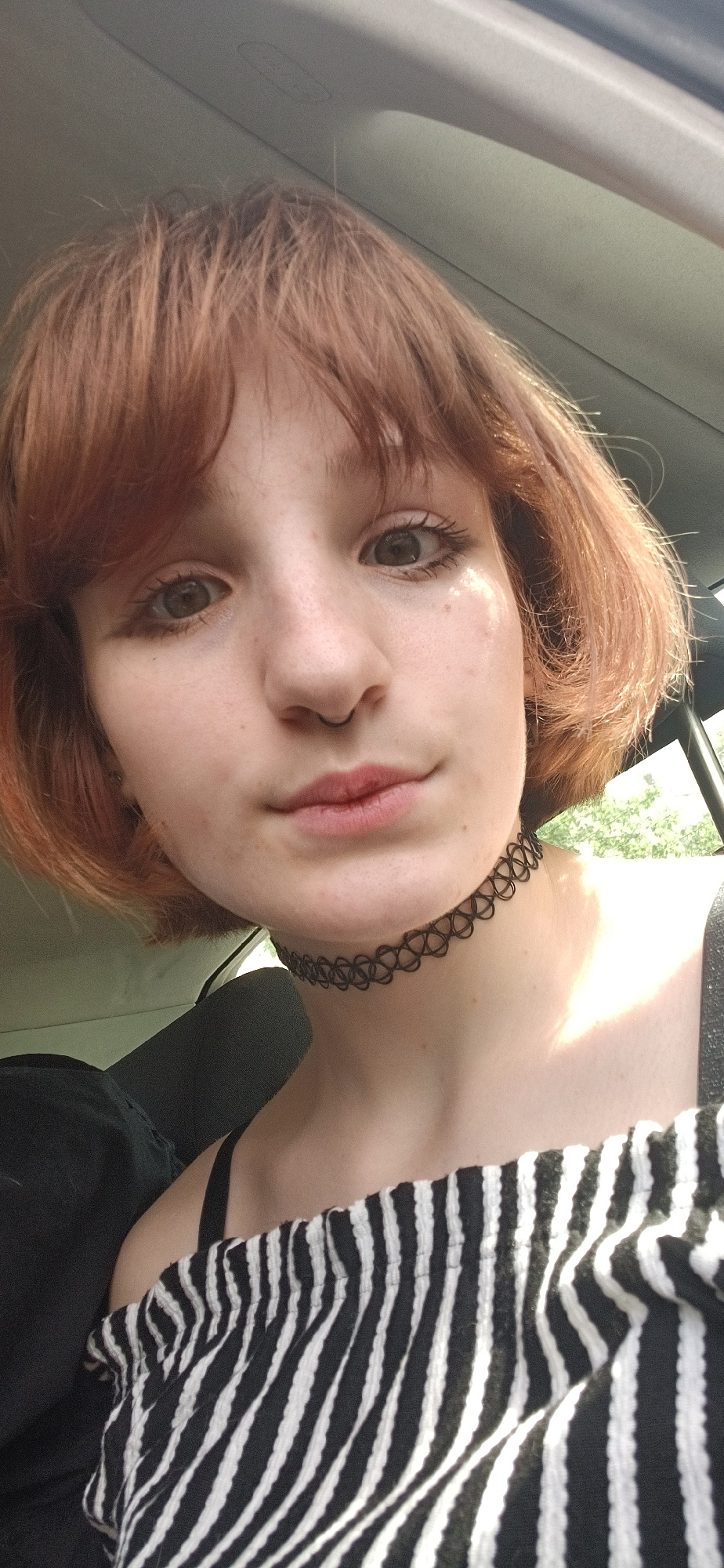 A young, fair-skinned person with short, reddish-brown hair is facing the camera. They are wearing a black choker necklace and a black and white striped top. The person is positioned inside a vehicle,…read more