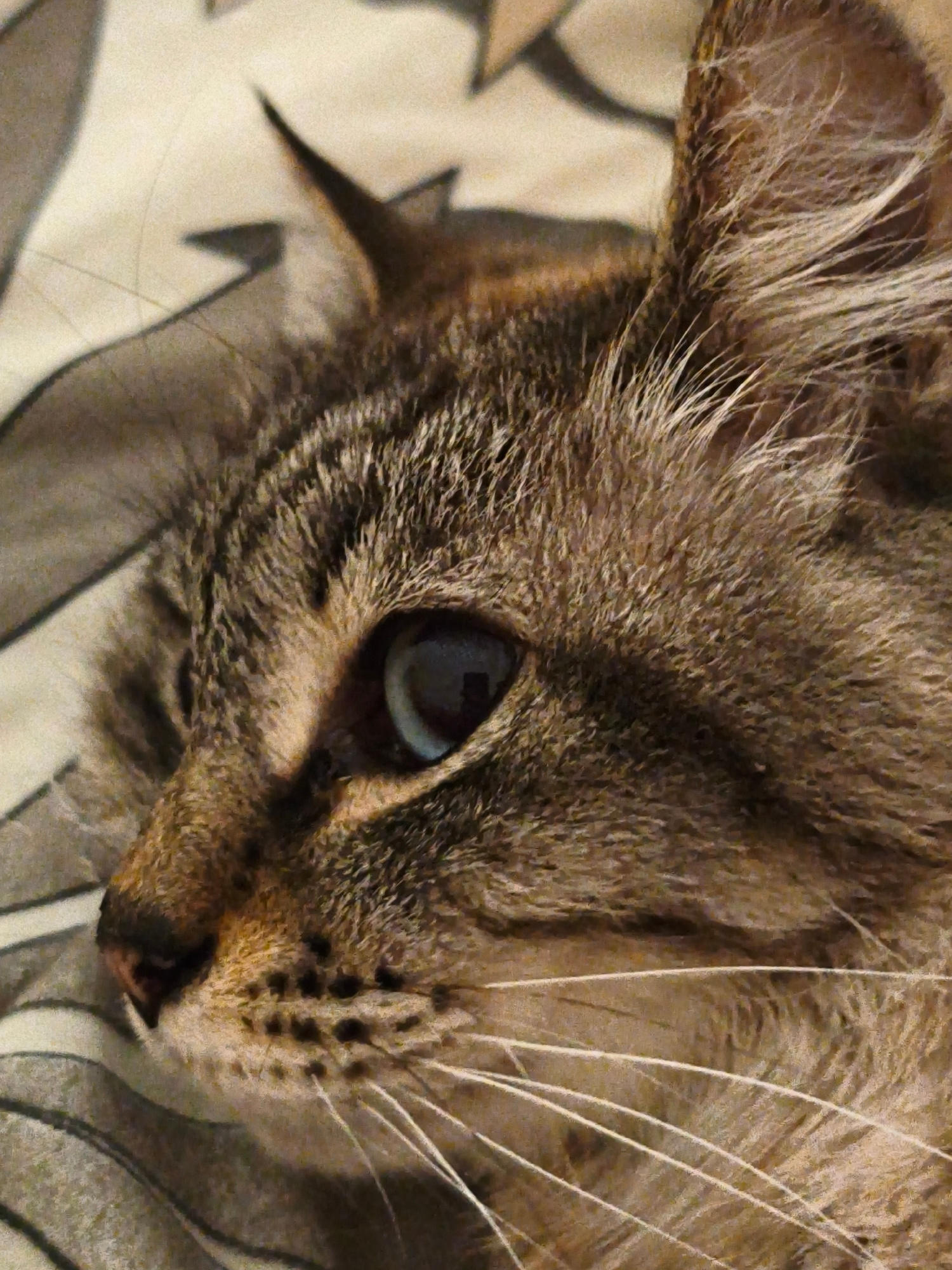 A close-up, indoor photograph captures the profile of a tabby cat resting on a patterned surface. The cat's eye, a striking blue, is in sharp focus. The cat is resting on a grey patterned surface. No…read more
