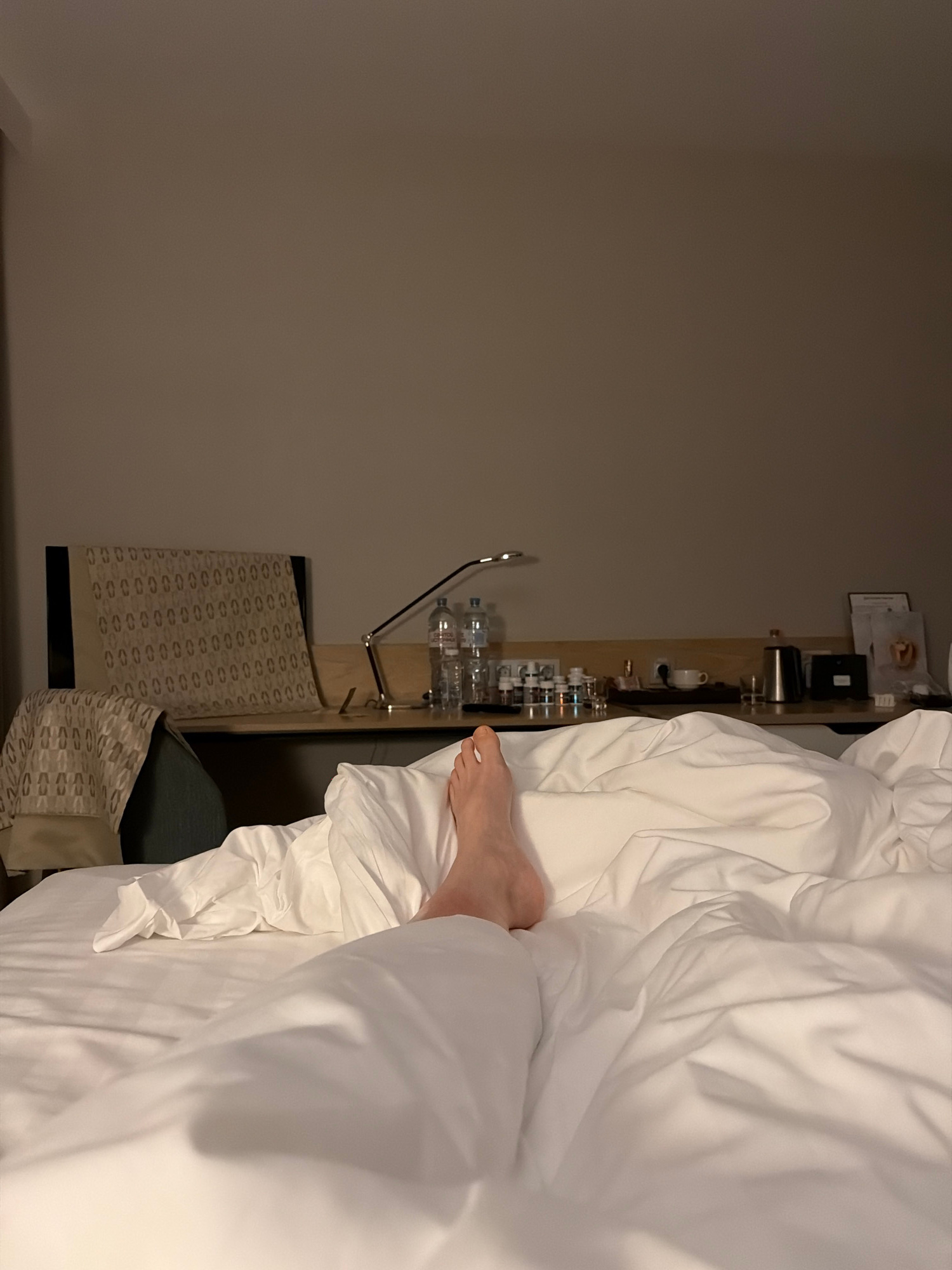 A top-down, slightly canted indoor shot shows a partially made bed with a foot visible near the edge. The bed is covered in white linens. Beside the bed is a nightstand featuring a table lamp, several…read more