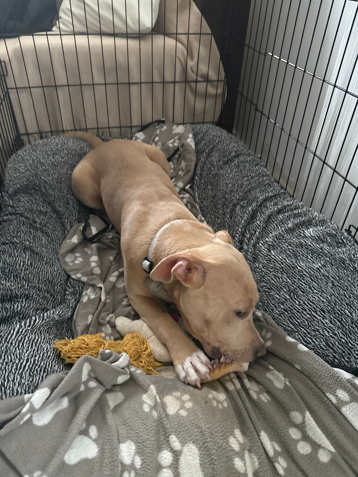 A tan-colored, short-haired puppy with a white collar is lying in a black wire crate on top of multiple blankets. The puppy is chewing on a light-colored object. One blanket is gray with white paw pri…read more