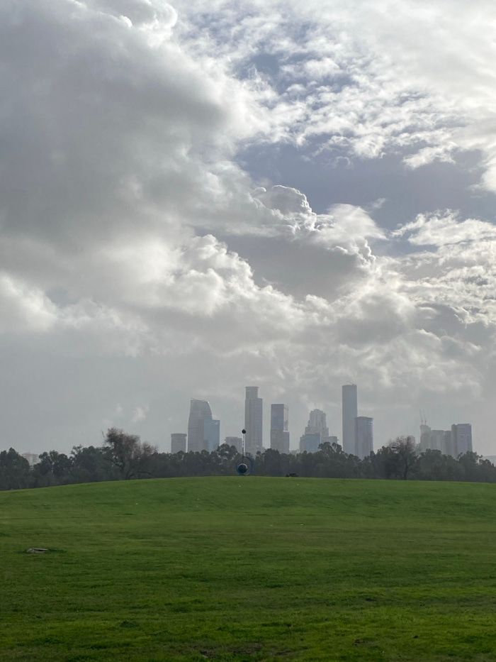 The image displays a panoramic view of a large green park in the foreground, transitioning to an urban skyline under a dramatic sky. The lower half of the frame is dominated by an undulating, vibrantβ¦read more