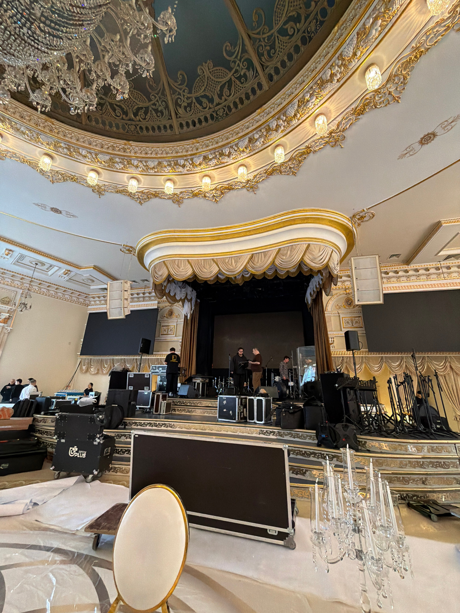 The image shows the interior of an ornate theater, likely in Moscow, Russia, given the architectural style. The theater stage is visible, with several people setting up equipment for what appears to b…read more