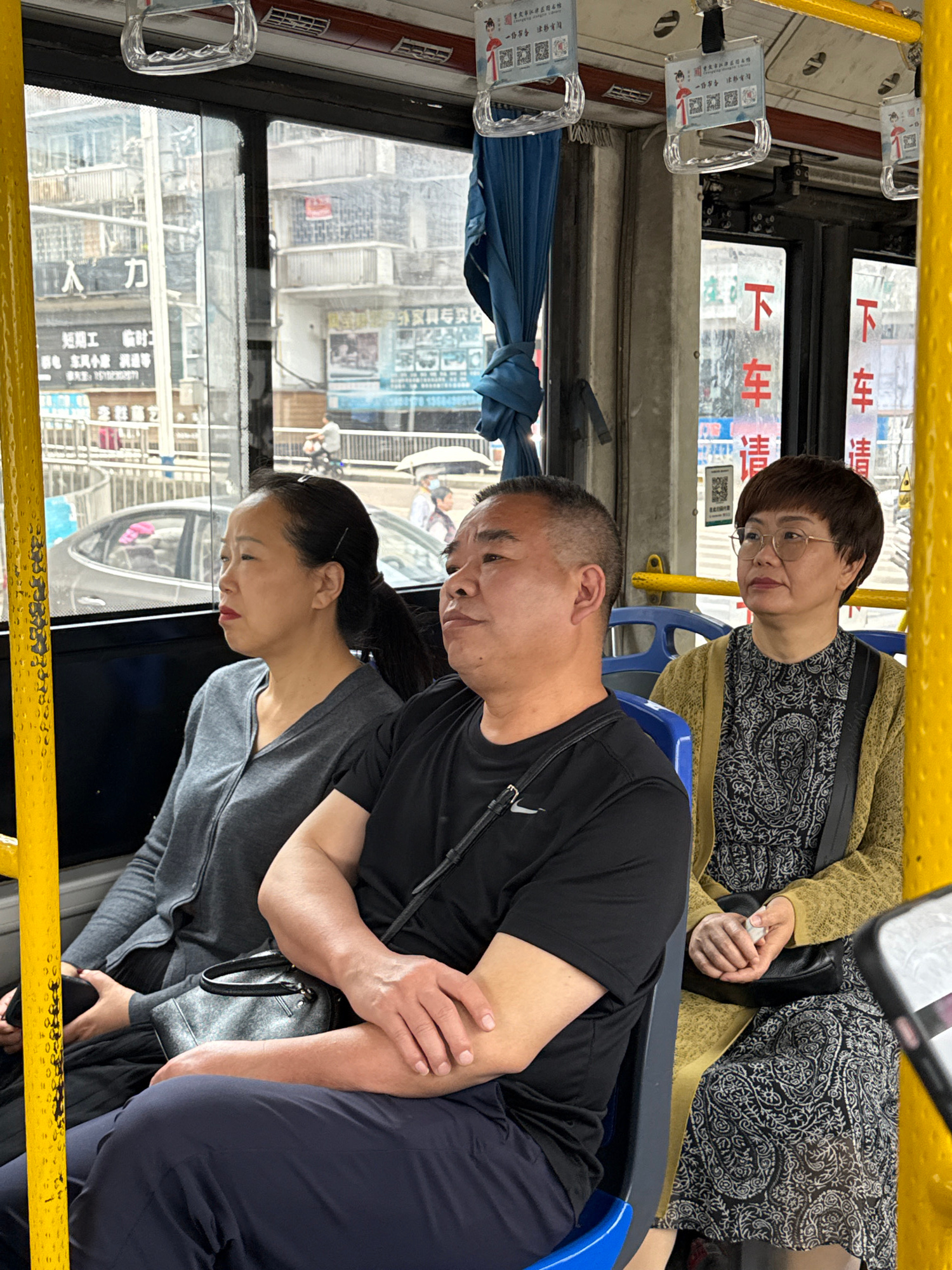 The image captures a scene inside a public bus. There are three passengers visible: an older woman wearing glasses and a patterned dress, a man in a black T-shirt, and a woman in a grey shirt. They ar…read more