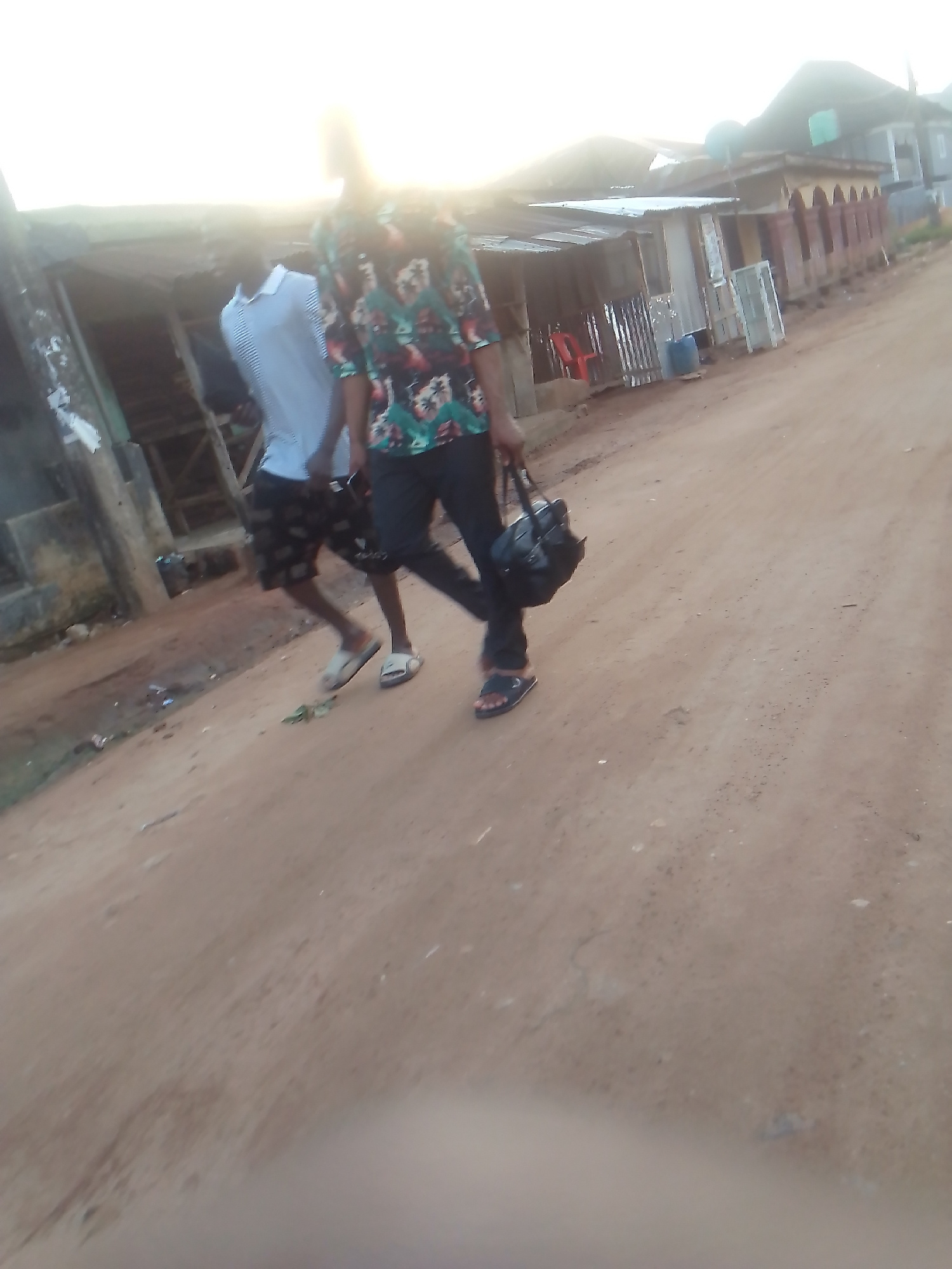 Two individuals walk along an unpaved, dirt-covered road in Owerri, Nigeria. The first, dressed in a patterned shirt, dark pants, and sandals, carries a black bag. The second, wearing a light-colored…read more