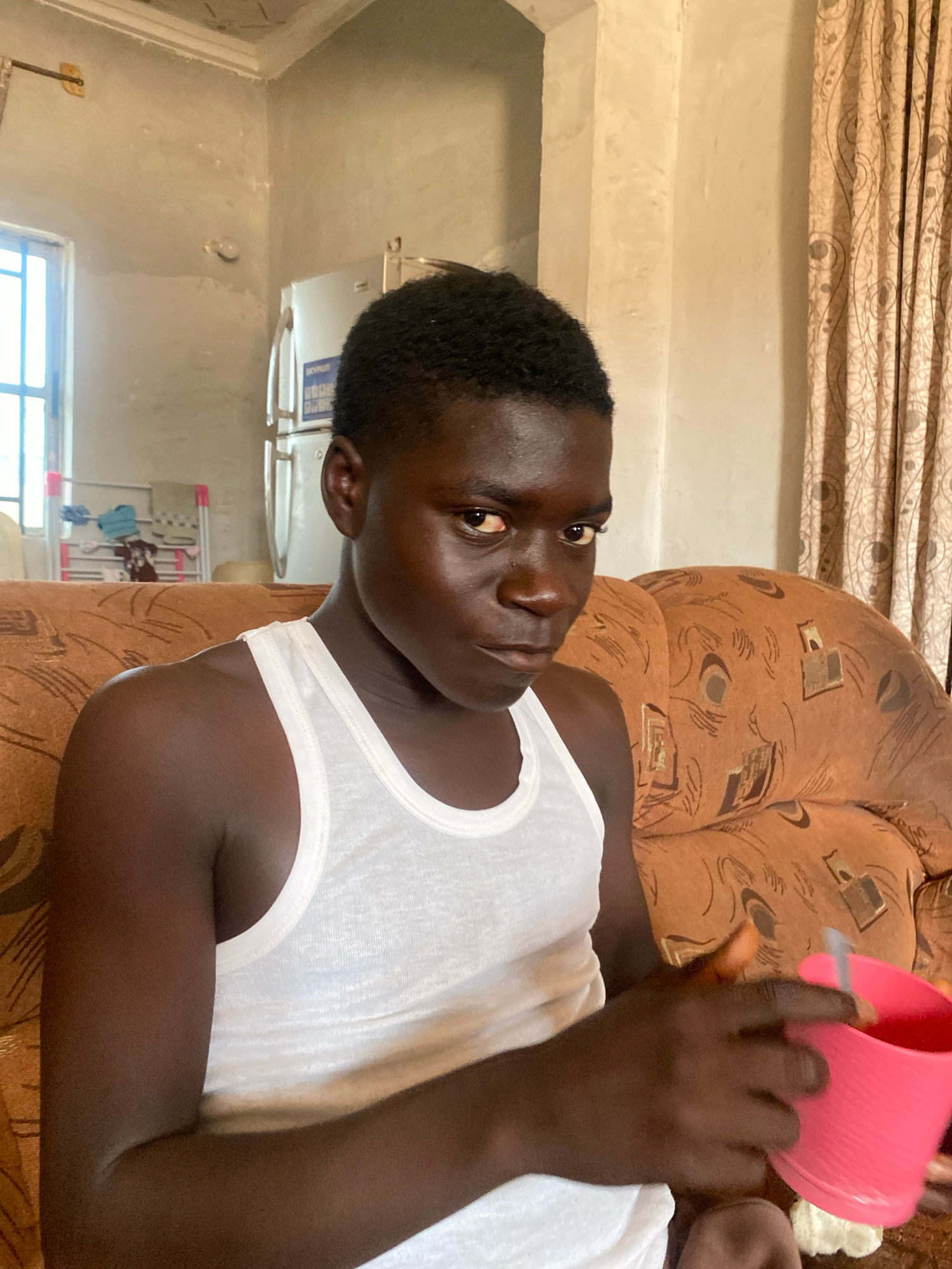 A dark-skinned person wearing a white tank top is lying on a brown patterned sofa indoors. The person is holding a pink cup. The location appears to be Rido, Nigeria, based on prior knowledge. The roo…read more