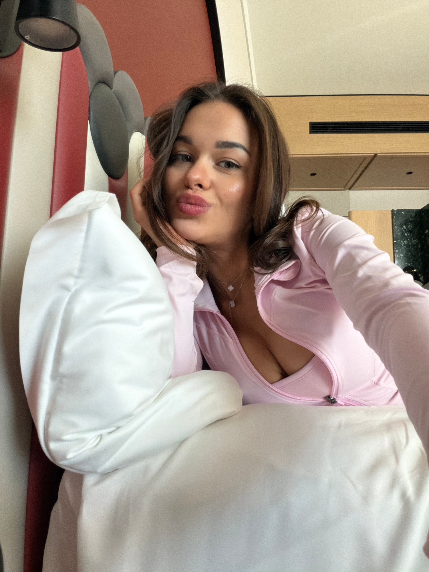 A woman with brown hair is lying on a bed or examination table, propped up by a white pillow. She wears a light pink zippered jacket that is partially unzipped. The setting appears to be indoors, pote…read more