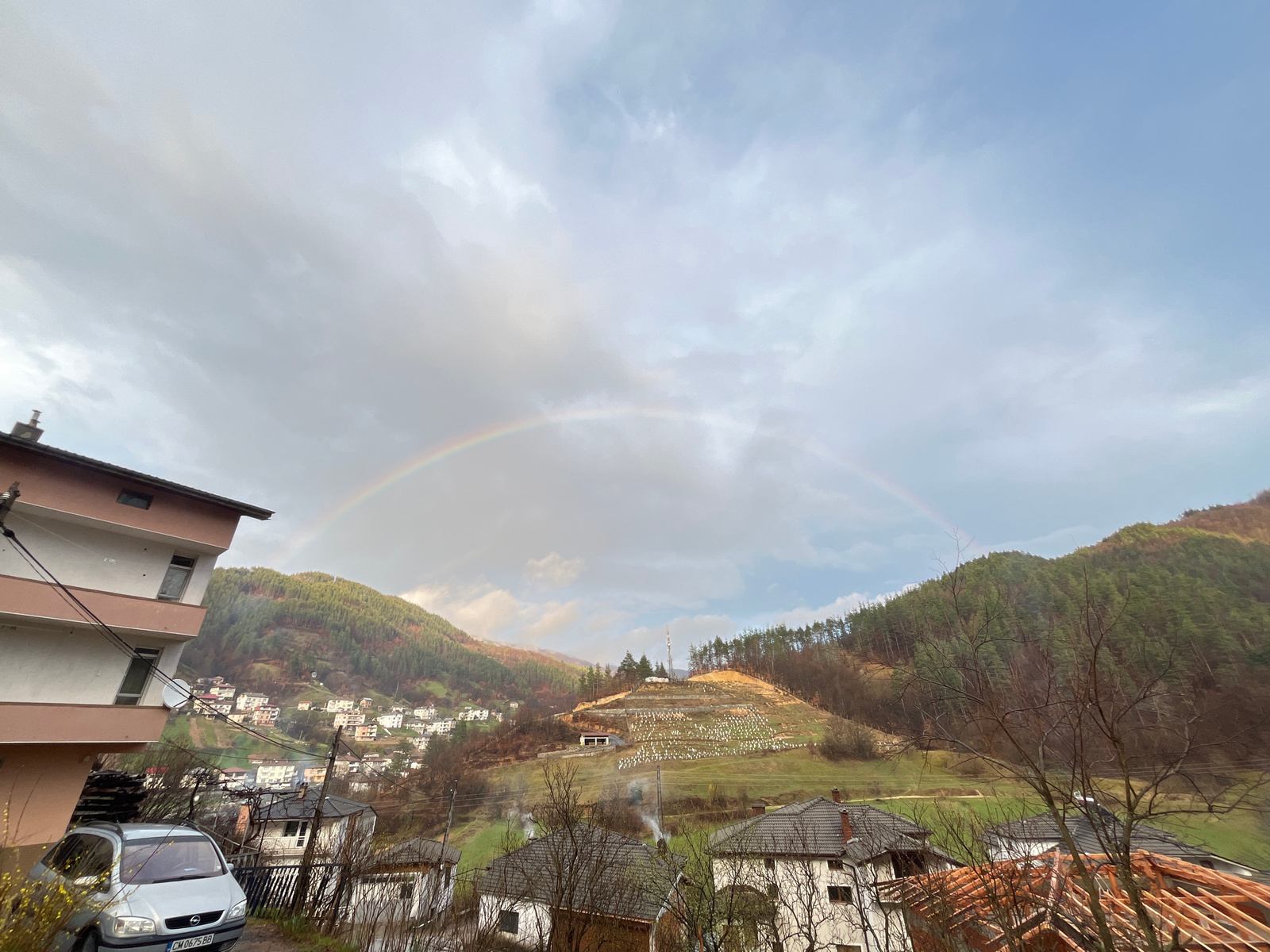 The image depicts a residential scene in Chepintsi, Bulgaria, set against a hilly backdrop under a sky with overcast clouds and a rainbow. In the foreground, there are houses with tiled roofs, and a s…read more