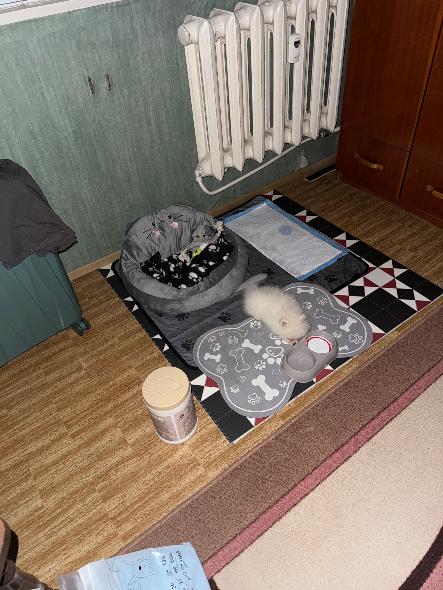 An elevated, oblique view depicts an indoor scene in Sofia, Bulgaria. A gray and black pet bed, shaped like a cat's face, rests beside a gray and black mat featuring bone and paw-print designs. A smal…read more