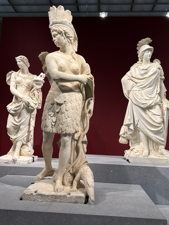 The image depicts three classical-style marble statues of female figures displayed within a gallery of the Louvre Abu Dhabi, located in Abu Dhabi, United Arab Emirates. In the foreground and center,…read more