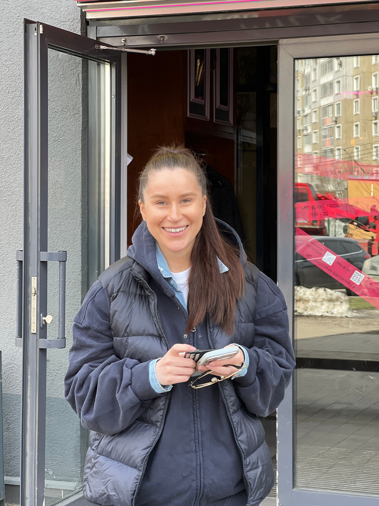 A woman is standing at the entrance of a business establishment in the city of Khimki, Russia. She is wearing a blue quilted jacket, a denim shirt, and a dark-colored sweatshirt. The woman is holding…read more