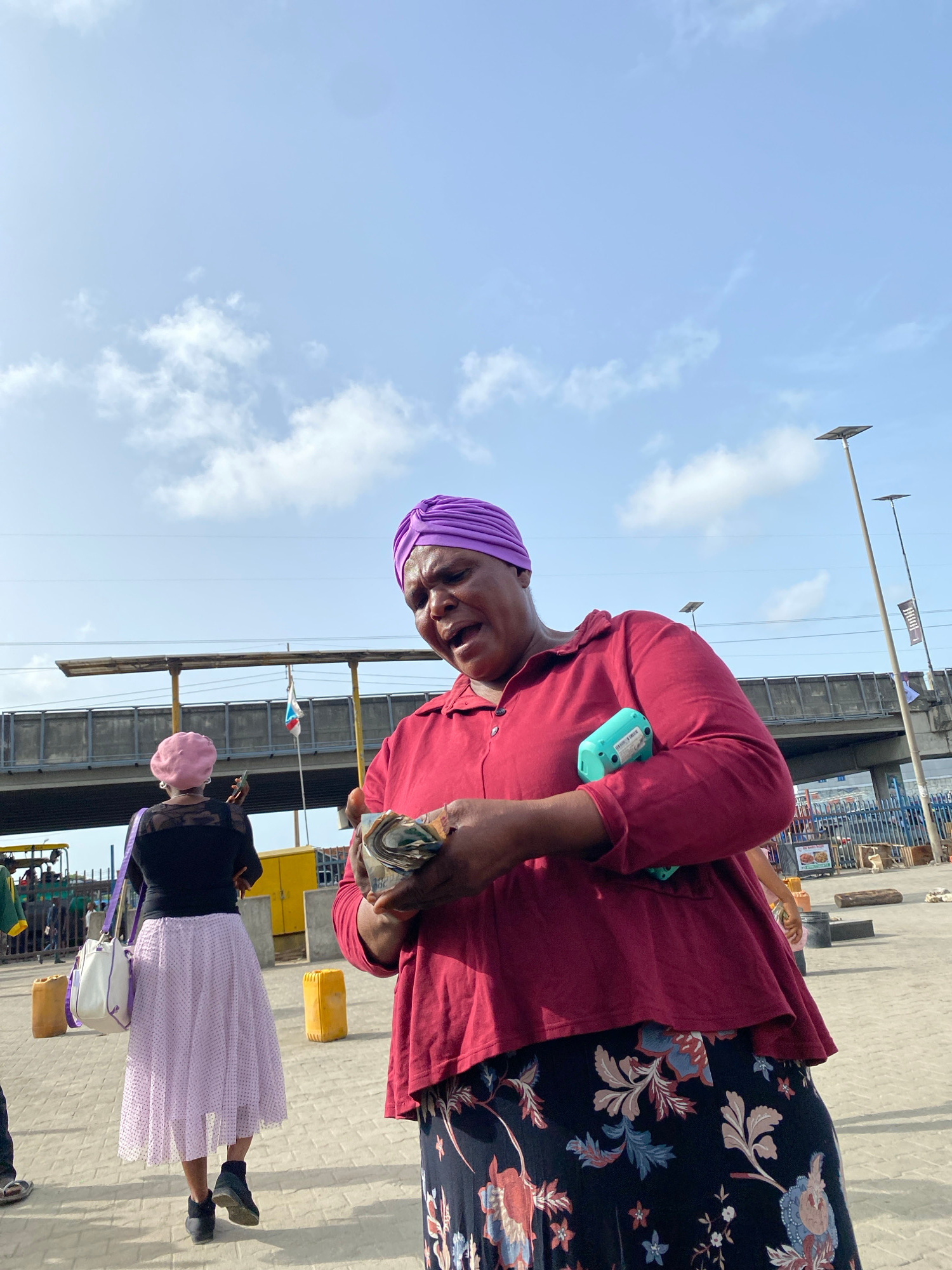 A medium shot of two women in Ado, Nigeria. The woman closest to the camera wears a purple headwrap, a dark red long-sleeved shirt, and a black floral skirt. She holds a wad of Nigerian currency in he…read more