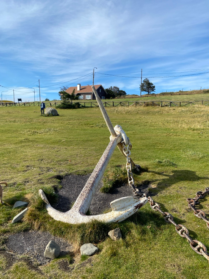 An outdoor scene in the city of Ushuaia, Argentina, is depicted under a bright blue sky with scattered cirrus clouds. A large, weathered white anchor, exhibiting rust and dirt stains, occupies the low…read more