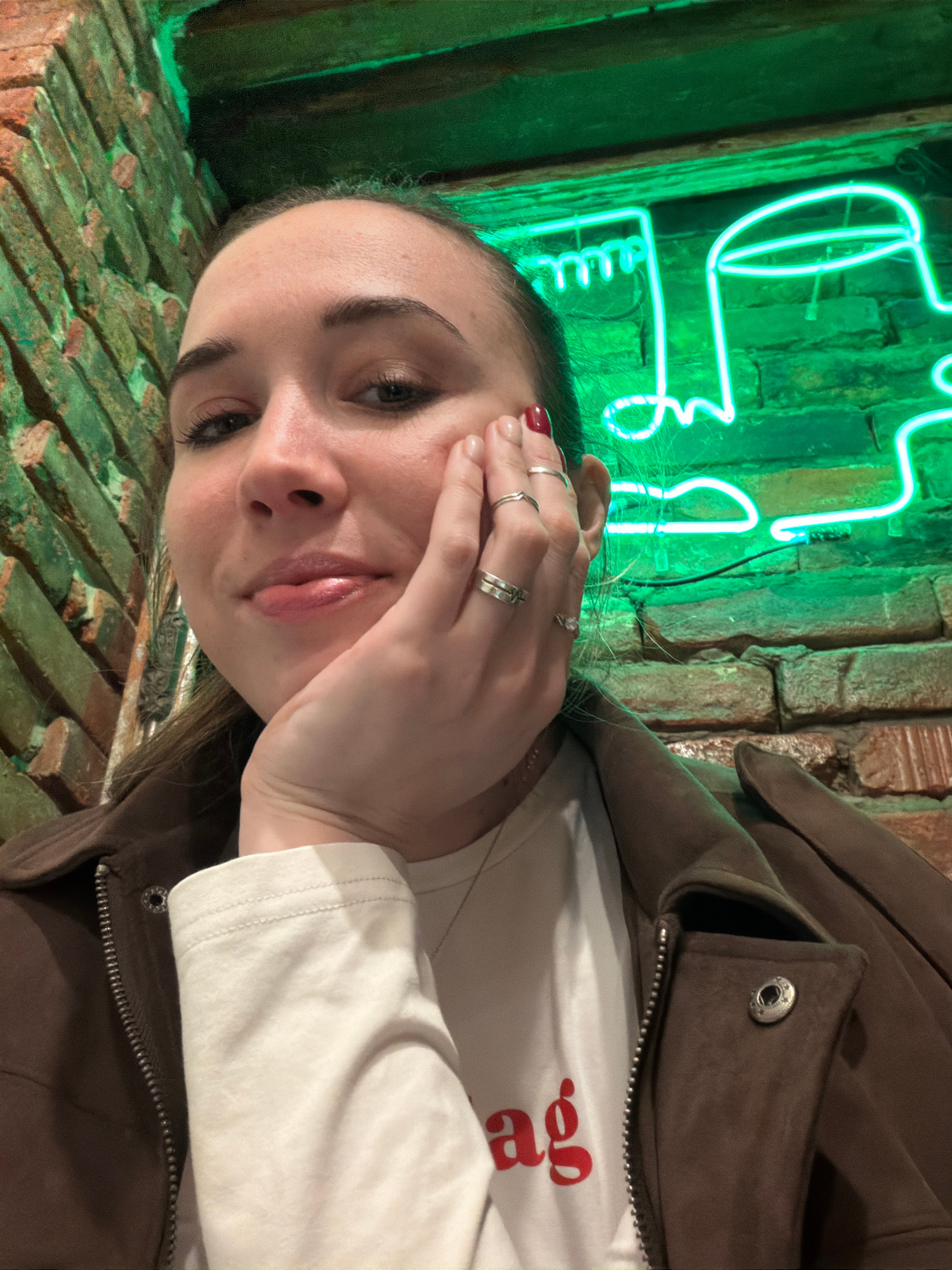 A woman is posing in front of a brick wall with a neon green light in the shape of a stylized face. She is wearing a white long-sleeved shirt under a brown jacket and several rings on her fingers. Theβ¦read more