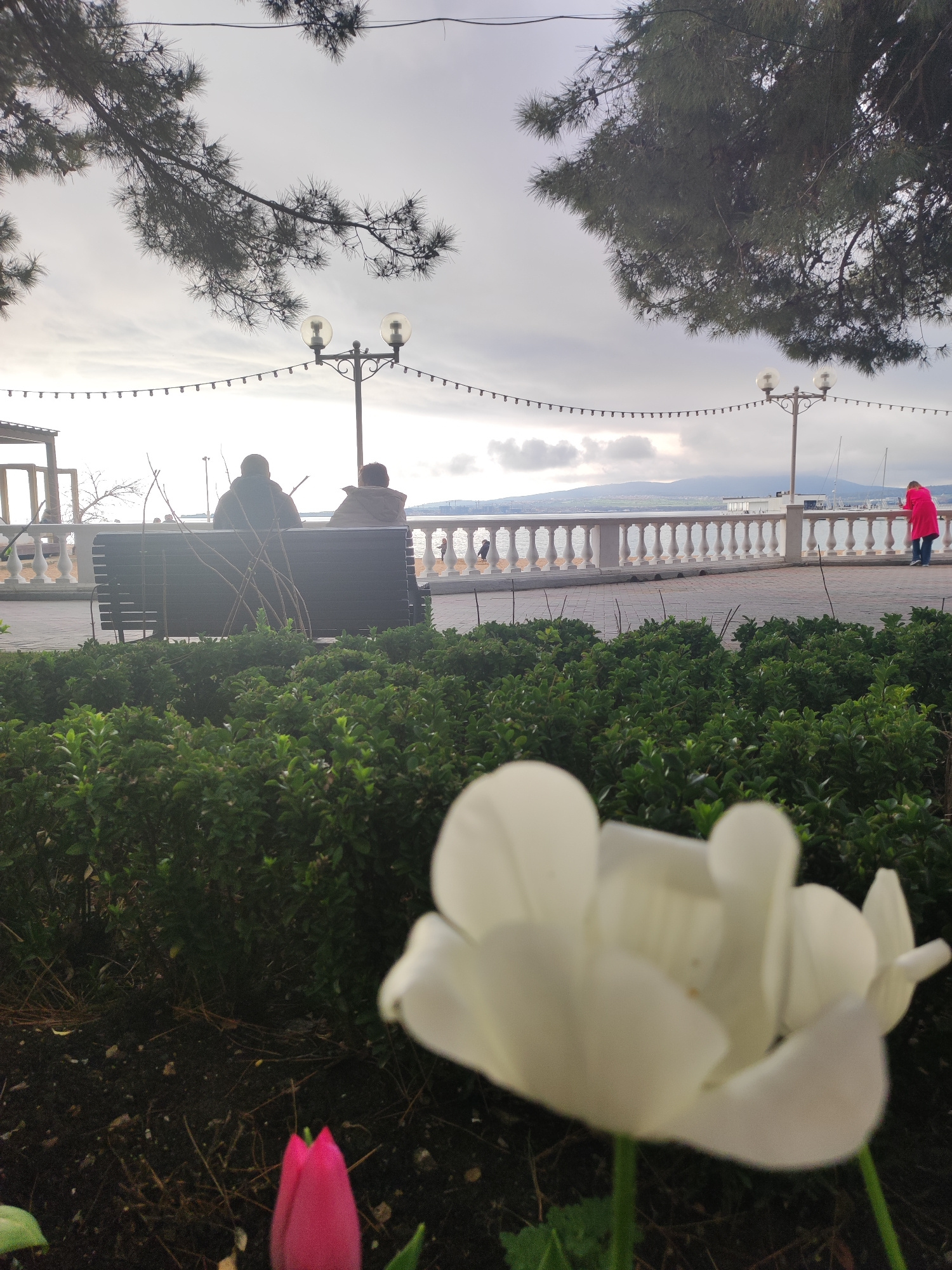The image captures a waterfront scene in Gelendzhik, Russia on an overcast day. Two individuals sit on a park bench facing away from the camera, positioned near a white balustrade overlooking the sea.…read more