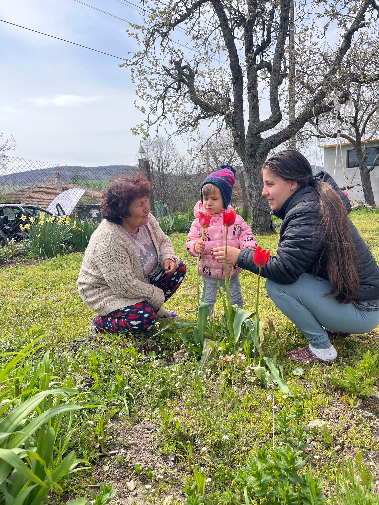 The image depicts three people in a grassy outdoor setting with a tree. An adult woman with long dark hair and wearing a black jacket and light blue pants is crouched near a small child in a pink jack…read more